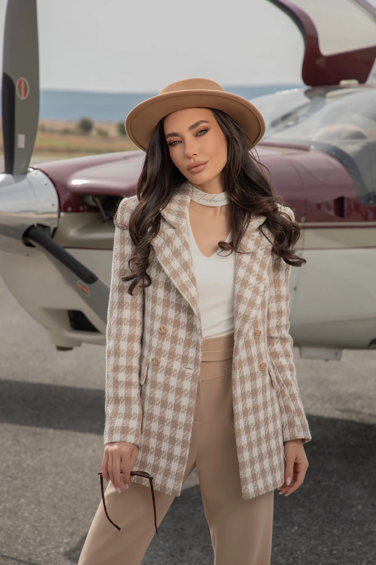 Бежов ефектен панталон с висока талия, плохи, джобове и закопчаване в предната част. Моделът е с колан от основния плат с чантичка с нежен надпис "CHRISTINE" и закопчаване с метална златиста тока. Чантичката е подвижна и колана може да бъде носен и без нея. Изработен е от висококачествена, мека и плътна италианска материя.