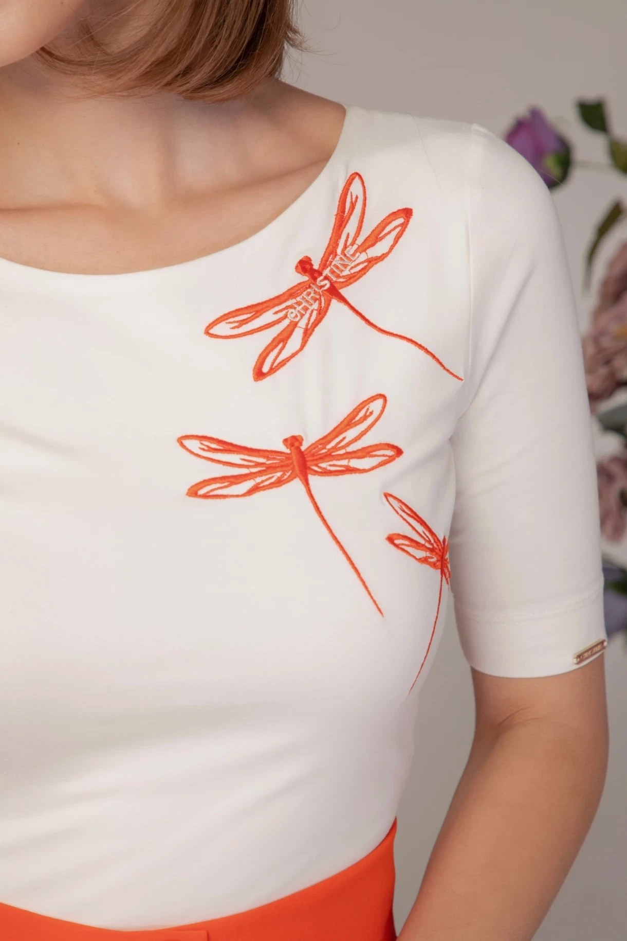 Блузка в бяло с нежна "CHRISTINE" бродерия с водни кончета в оранжев цвят, изработена от 100% памук. Моделът е с втален силует, лодка деколте и 3/4 ръкав, декориран с метален златист аксесоар с лого "CHRISTINE". Моделът е изработен с двойна предна част.