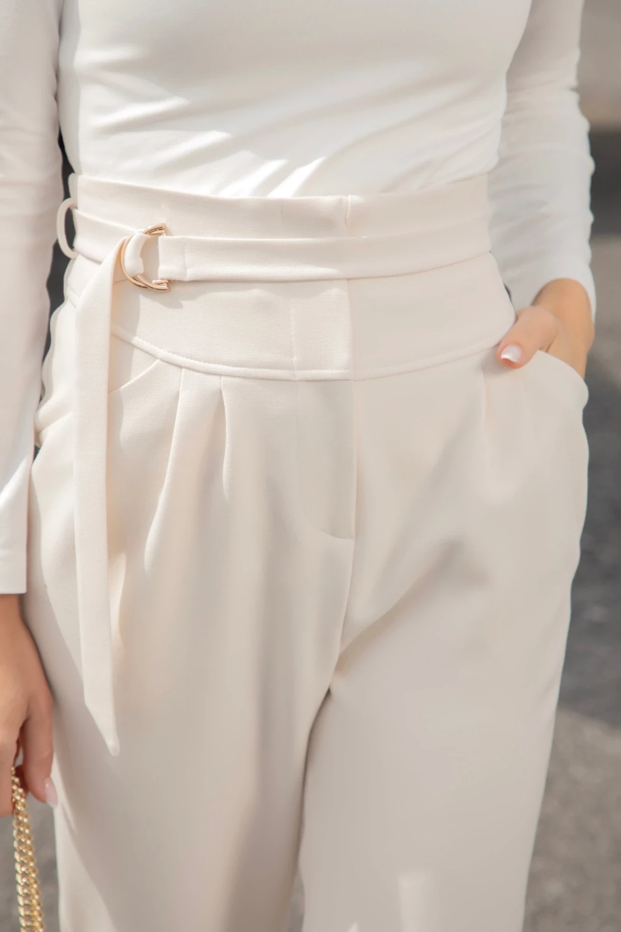 Бял ефектен панталон с висока талия, плохи, джобове и закопчаване в предната част. Моделът е с колан от основния плат с чантичка с нежен надпис "CHRISTINE" и закопчаване с метална златиста тока. Чантичката е подвижна и колана може да бъде носен и без нея. Изработен е от мека и плътна италианска материя.