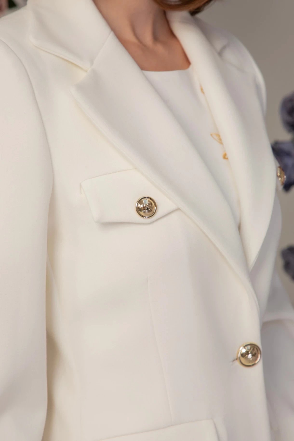 Елегантно сако в бяло с втален силует, ревери и джобове с филетки и капаци. Моделът е с едноредно закопчаване и метални копчета в златисто с лого. Сакото е изработено от плътна и нежна италианска материя и е изцяло подплатено с луксозна брандирана подплата. Моделът е с ефектен отделен колан от основния плат с метално златисто лого "CHRISTINE".
