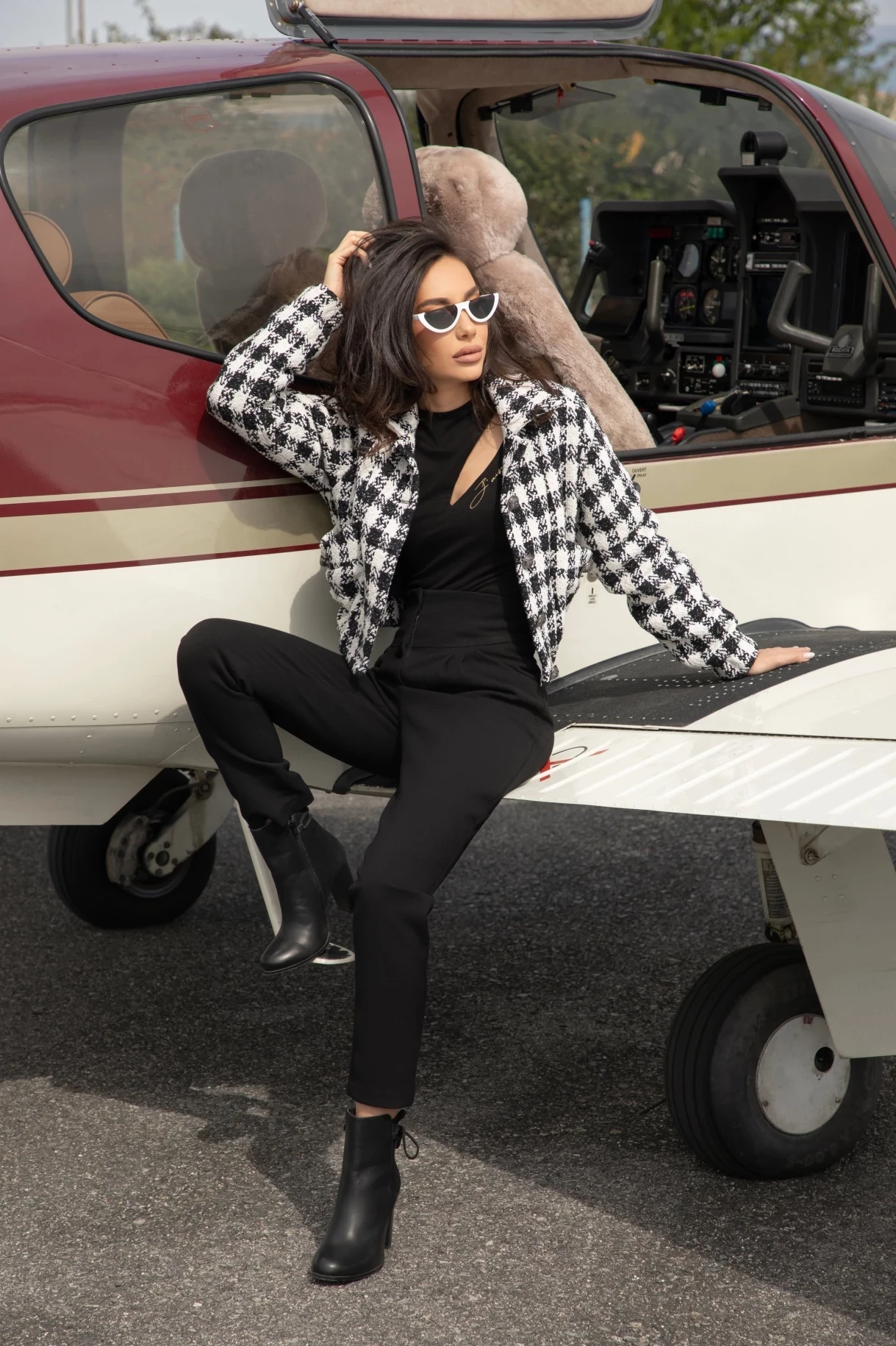 Черен ефектен панталон с висока талия, плохи, джобове и закопчаване в предната част. Моделът е с колан от основния плат с чантичка с нежен надпис "CHRISTINE" и закопчаване с метална златиста тока. Чантичката е подвижна и колана може да бъде носен и без нея. Изработен е от висококачествена мека и плътна италианска материя.