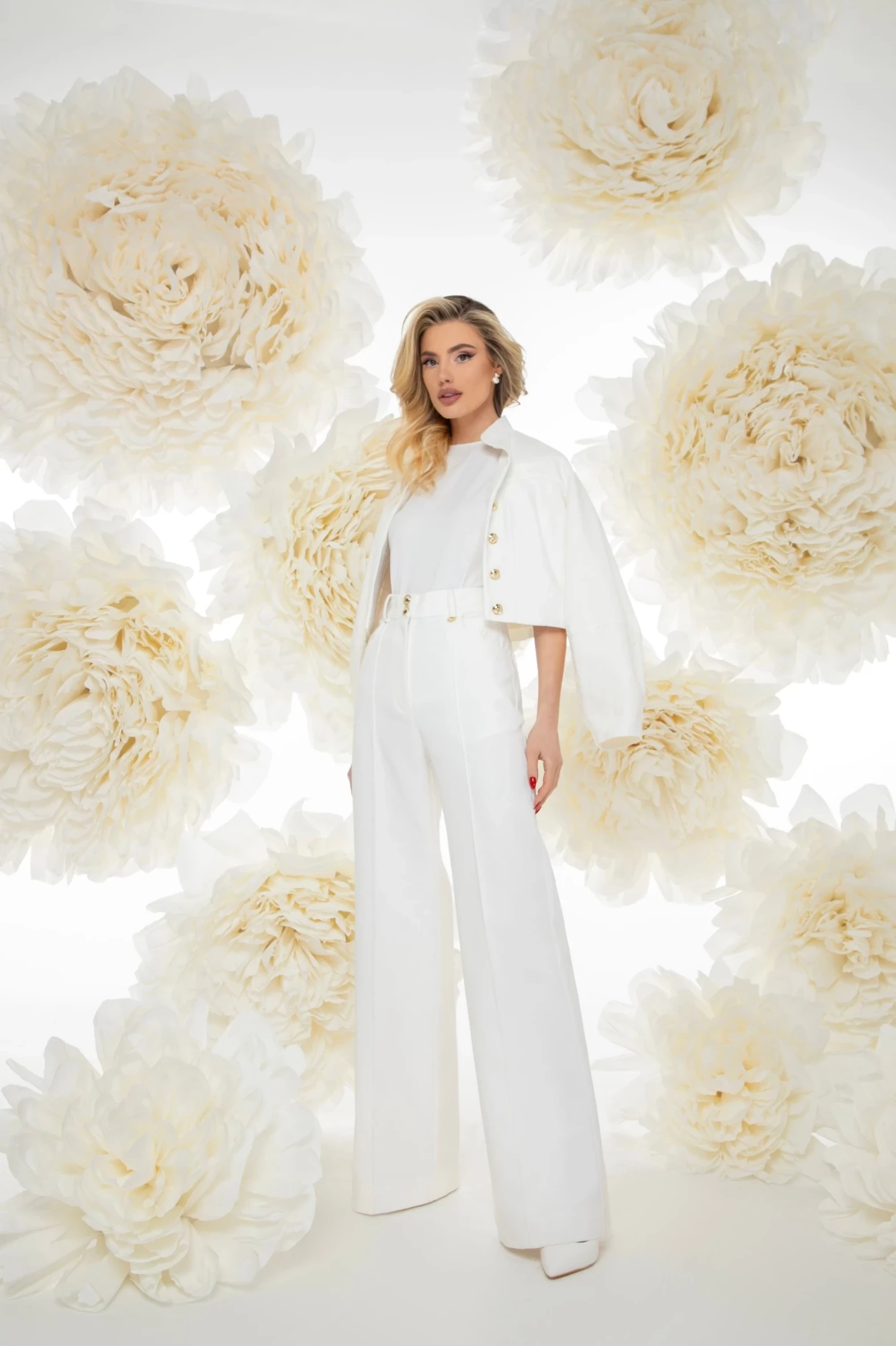 Широк дълъг панталон в бяло с висока талия, изработен от дънкова памучна материя. Моделът е с ръб с машинен бод, джобове в предната и задната част, закопчаване с цип "YKK" и метална златиста висулка и копчета с лого. Панталонът е с допълнително малко джобче в предната част с бродерия CHRISTINE.