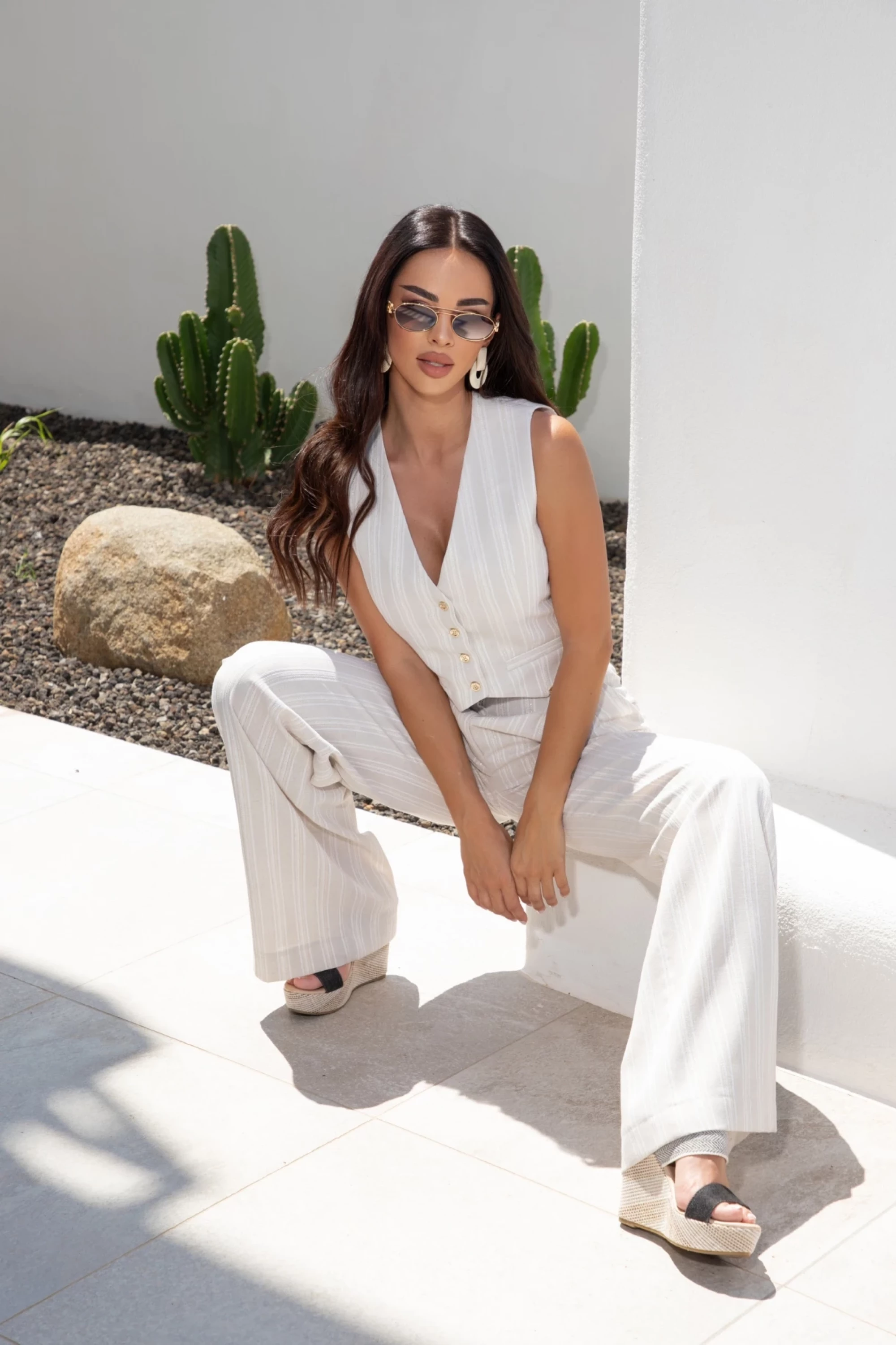 Елек с втален силует, изработен от разкошен лен със златисти нишки. Моделът е със закопчаване в предната част с метални златисти копчета и плочка с лого.