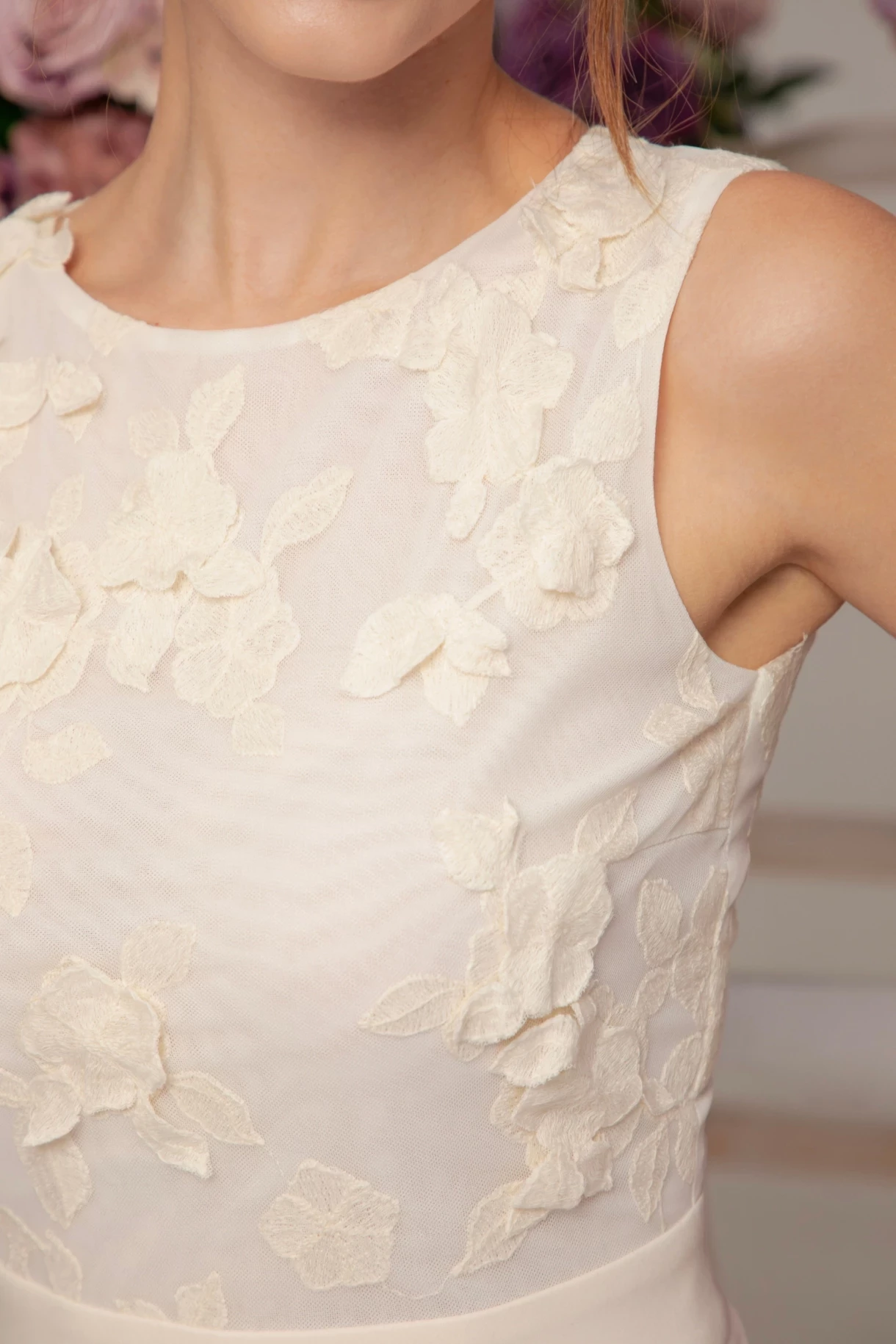Стилен дълъг гащеризон в екрю, изработен от красива 3D мрежа и тежко падаща материя с лека еластичност. Гащеризонът е ръчно декориран в предната част с цветчета от основната материя. Моделът е с лодка деколте и закопчаване в задната част със скрит "YKK" цип.