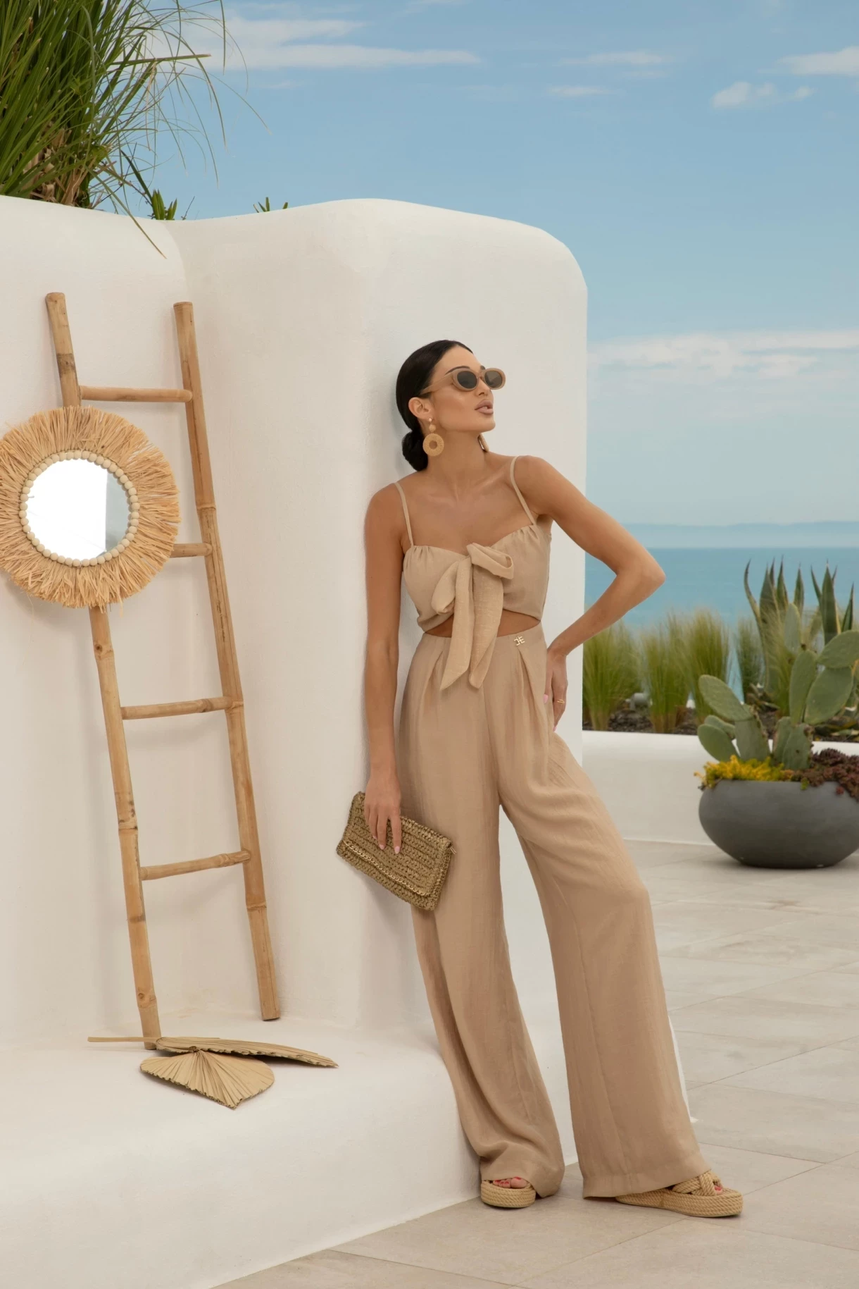 Бежов гащеризон, изработен от нежна и ефектна вискоза с фин блясък. Моделът е с дълги крачоли с плохи, регулиращи се презрамки, сърцевидно деколте с отделна връзка от основния плат за завръзване, която можете да носите на деколтето или като аксесоар за коса или чанта. Гащеризонът е декориран с метална златиста висулка с лого. Моделът е изцяло подплатен с нежен памук.