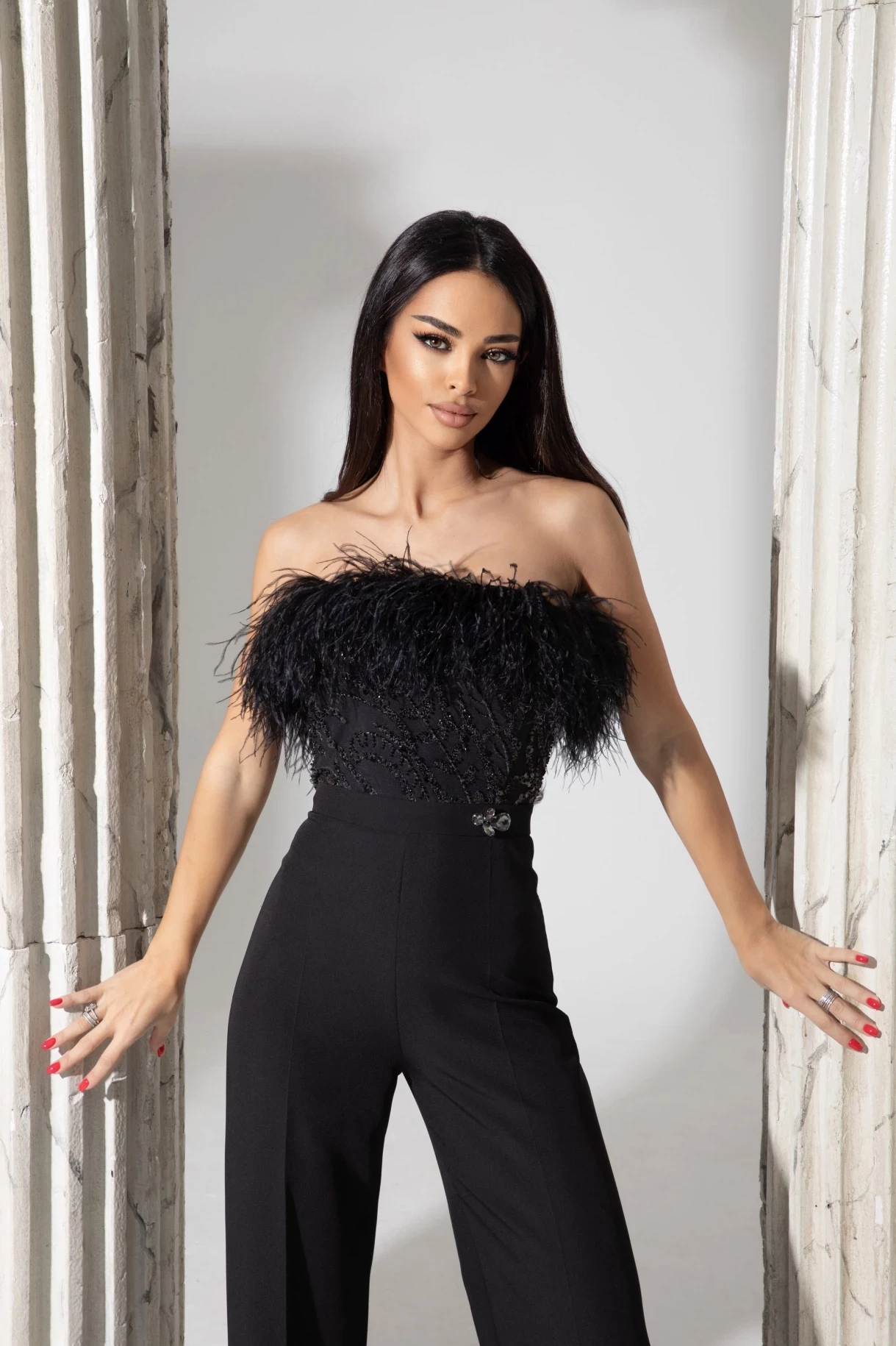 Луксозен гащеризон в черно, изработен с ефектни щраусови пера и красива висококачествена бляскава дантела. Моделът е с бюстие и широк панталон с ръб, изработен от италианска материя с лека еластичност. Гащеризонът е декориран на талията с кристални камъни в обков. Закопчаване в задната част със скрит "YKK" цип.