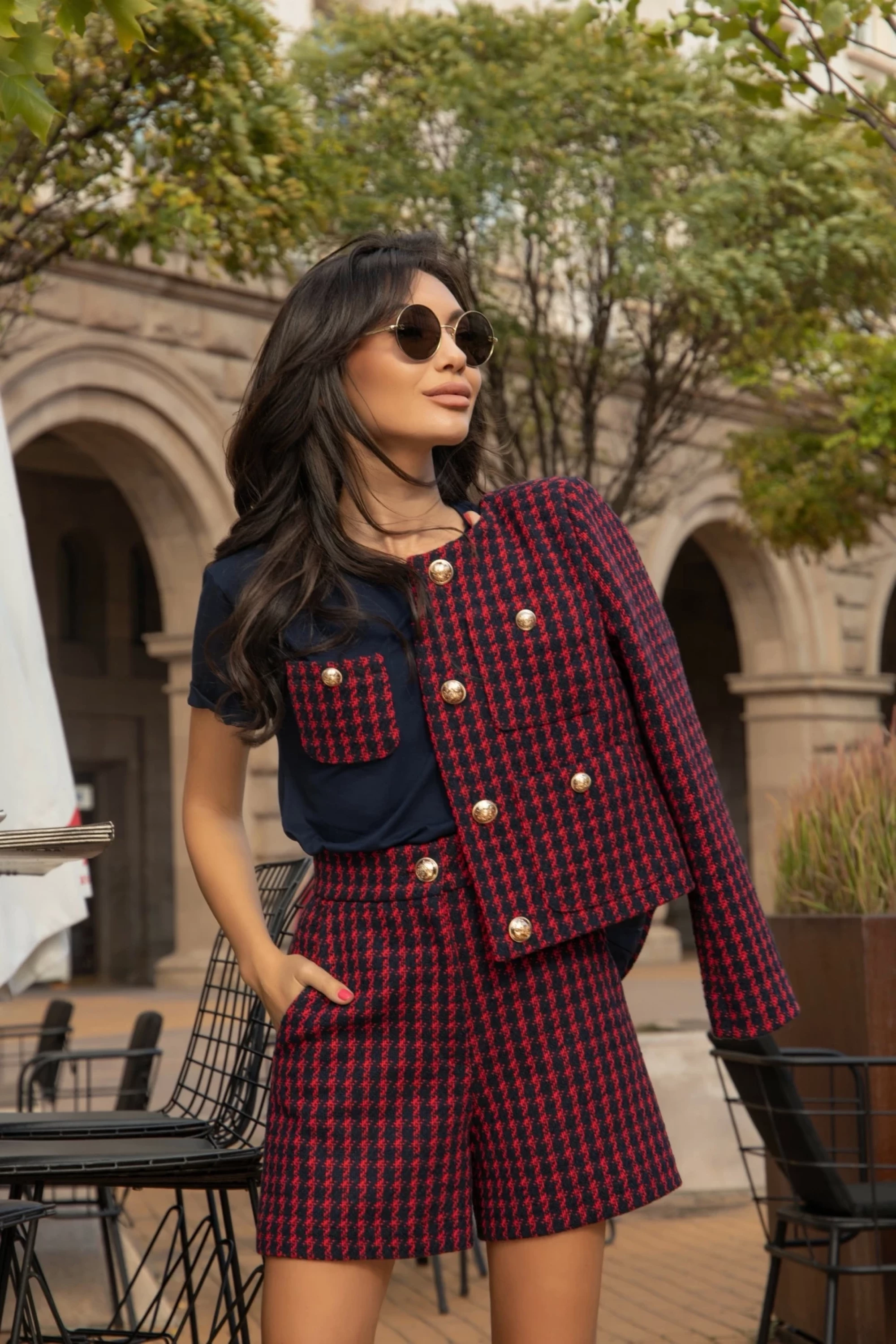 Къси панталонки с висока талия, джобове и закопчаване в предната част с цип и ефектно метално копче в златисто. Изработени са от висококачествено букле в червено и синьо.