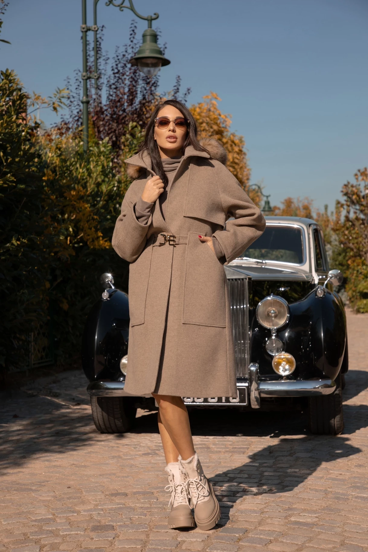 Дълго палто със свободен силует, ревери, външни джобове и закопчаване с метално златисто копче с лого. Палтото е с ефектен колан от основния плат, чиято двойна структура на металното златисто лого CHRISTINE се среща и приляга безупречно при закопчаването. Моделът е със сваляща се качулка с косъм от естествена кожа и може да се носи по два начина. Изработенo е от плътна и мека италианска вълна и луксозна брандирана подплата.