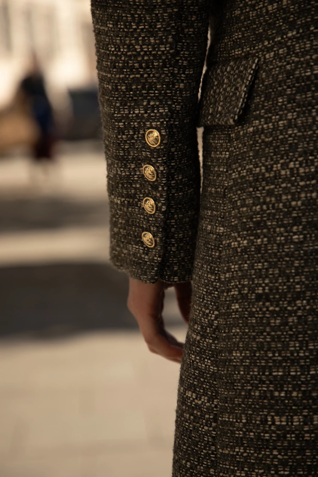 Елегантно палто в сиво и екрю с втален силует, ревери, шлиц и двуредно закопчаване. Изработенo е от висококачествена и плътна италианска вълна и луксозна брандирана подплата. Палтото е с джобове и капаци, закопчаване в предната част и на ръкавите с метални златисти копчета с лого "CHRISTINE". Моделът е с декоративно коланче в задната част на талията с метална златиста тока с лого "CHRISTINE".