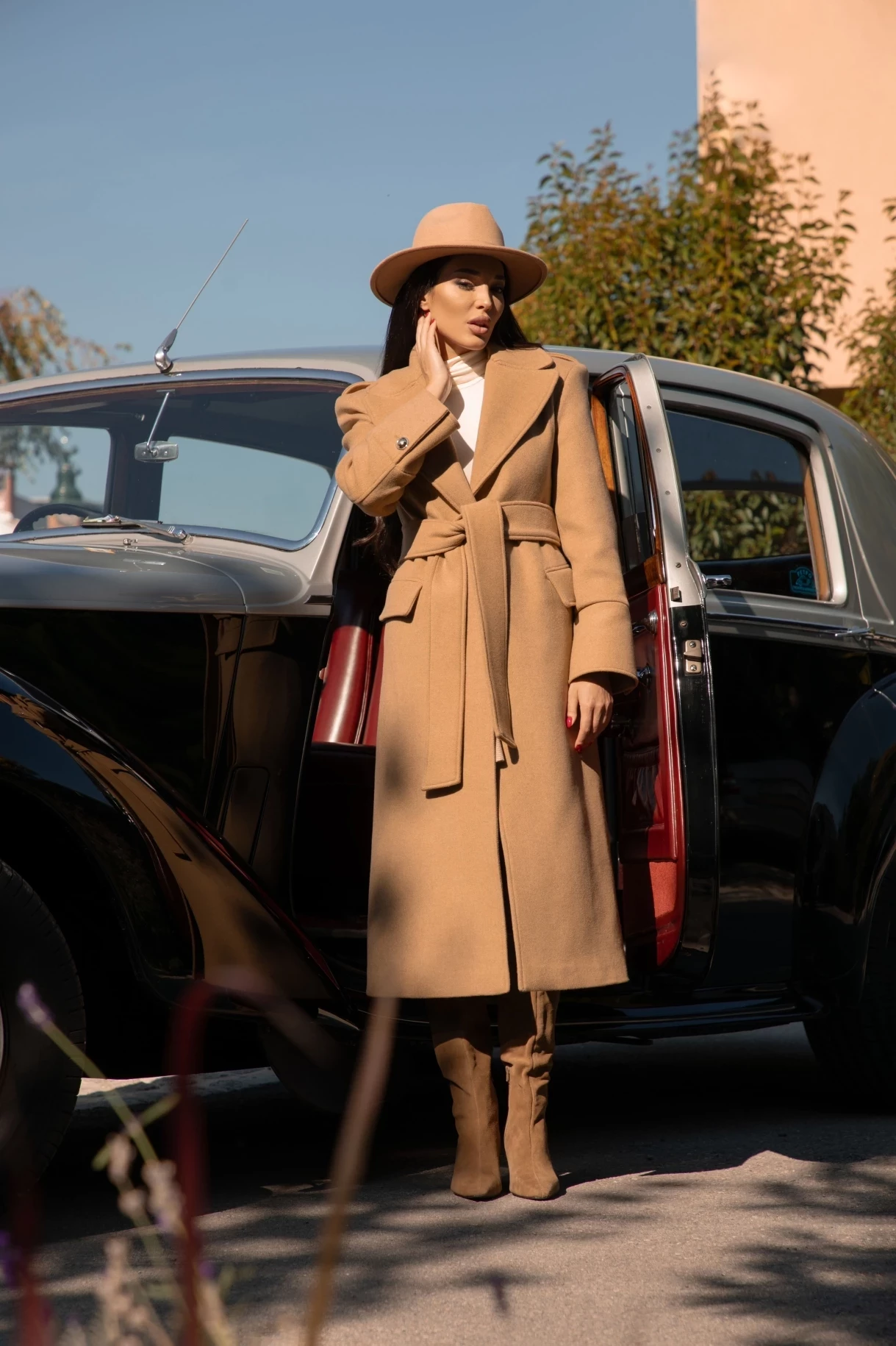 Дълго палто в камел, изработенo от висококачествена, плътна и мека италианска вълна с луксозна брандирана подплата. Моделът е с ревери, ефектни рамене, щривки с копчета на раменете, шлиц в задната част и джобове с капаци. Палтото е с едноредно закопчаване в предната част, отворен шлиц на ръкава и метални копчета в златисто с лого. Моделът е с гайки и колан изработен от основната материя.