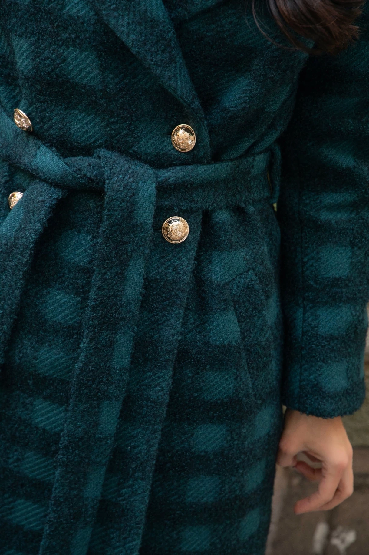 Палто в тъмнозелен/петролен/ цвят с прав силует, ревери и прехвърлянe. Моделът е декориран с ефектни метални златисти копчета. Изработенo е от плътна и мека италианска вълна и луксозна сатенирана подплата. Палтото е с закопчаване в предната част с метални златисти копчета. Моделът е с джобове и колан от основния плат.