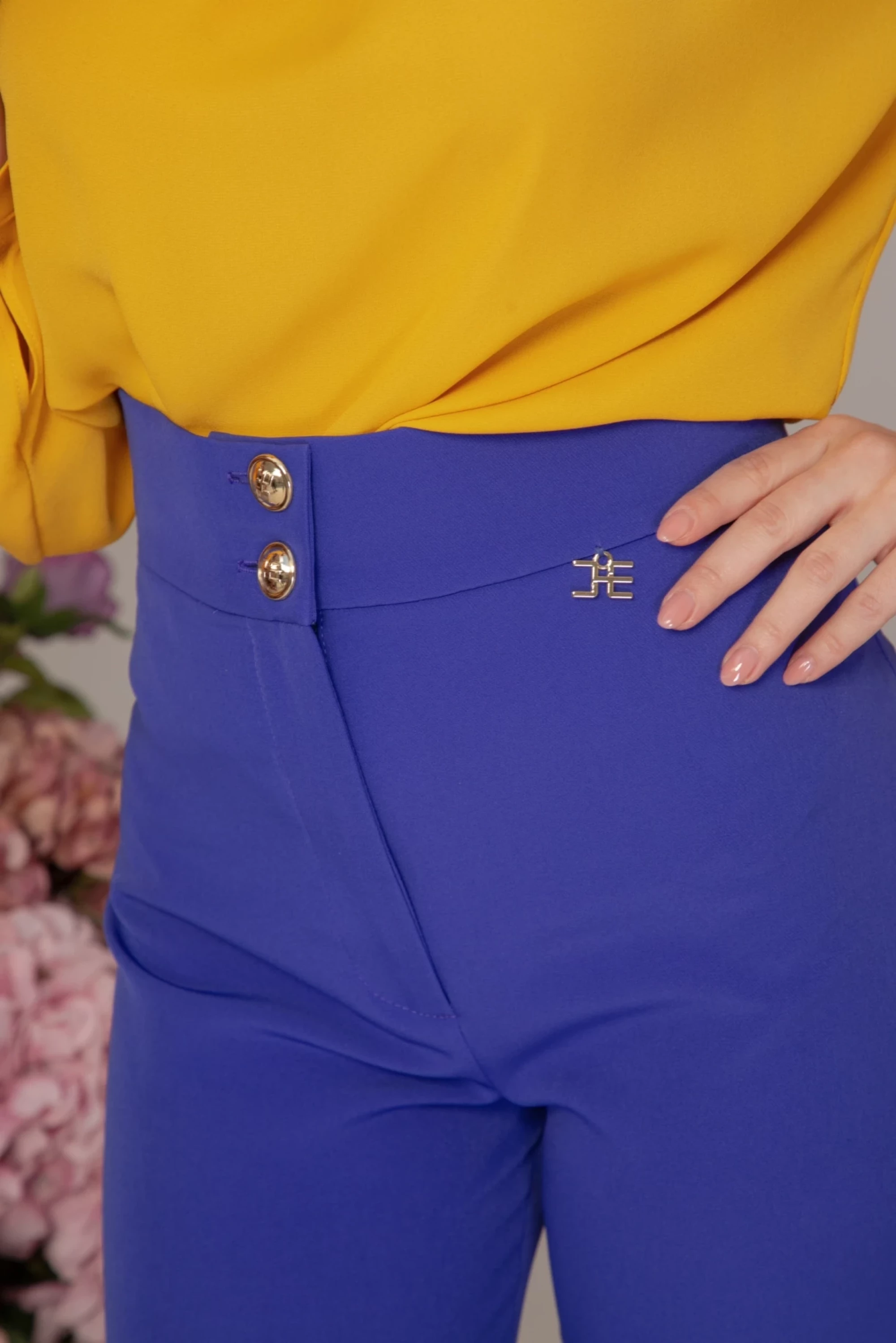 Широк дълъг панталон в кобалтово синьо с висока талия, изработен от нежна тежко падаща материя с лека еластичност. Моделът е със закопчаване в предната част с цип "YKK", копчета с лого "CHRISTINE" и метална златиста висулка.