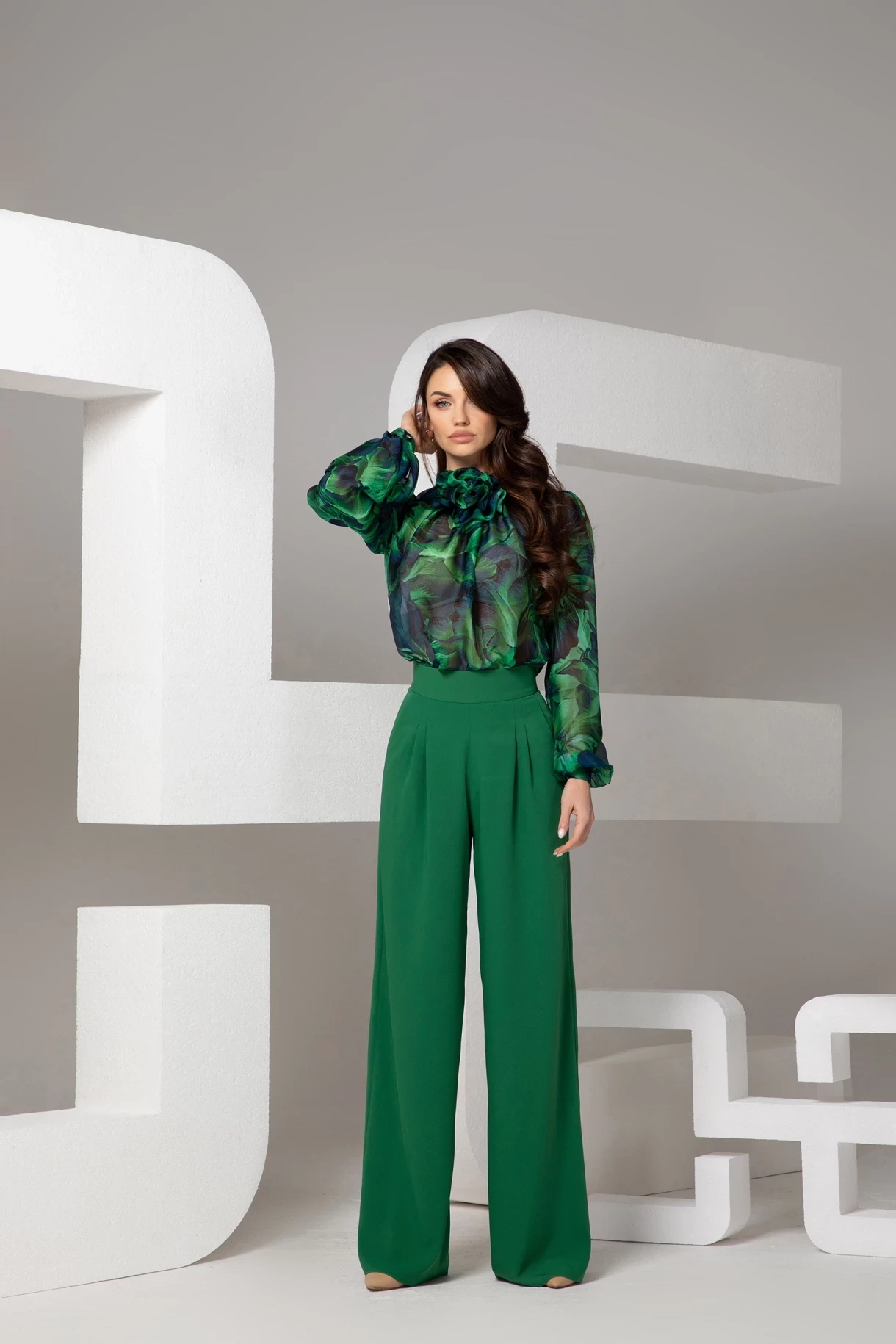 Широк панталон с висока талия в зелено, изработен от нежна, галеща тялото тежко падаща материя. Моделът е с плохи, странични джобове и закопчаване в задната част със скрит цип "YKK".