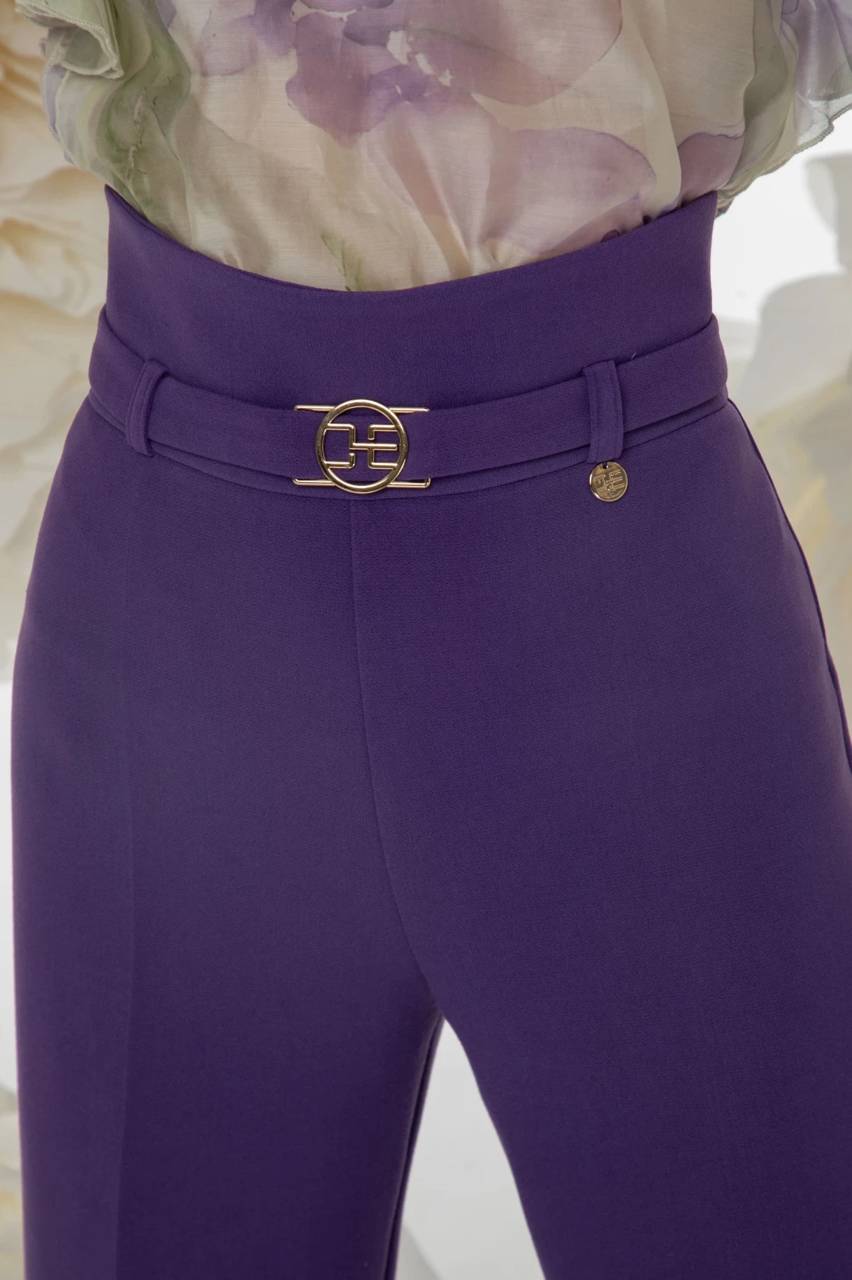 Дълъг панталон в лилаво с висока талия, изработен от плътна и свободно падаща материя с лека еластичност. Моделът е с гайки, закопчаване в задната част със скрит цип "YKK", висулка с лого и колан от основния плат с метална златиста тока с лого CHRISTINE.