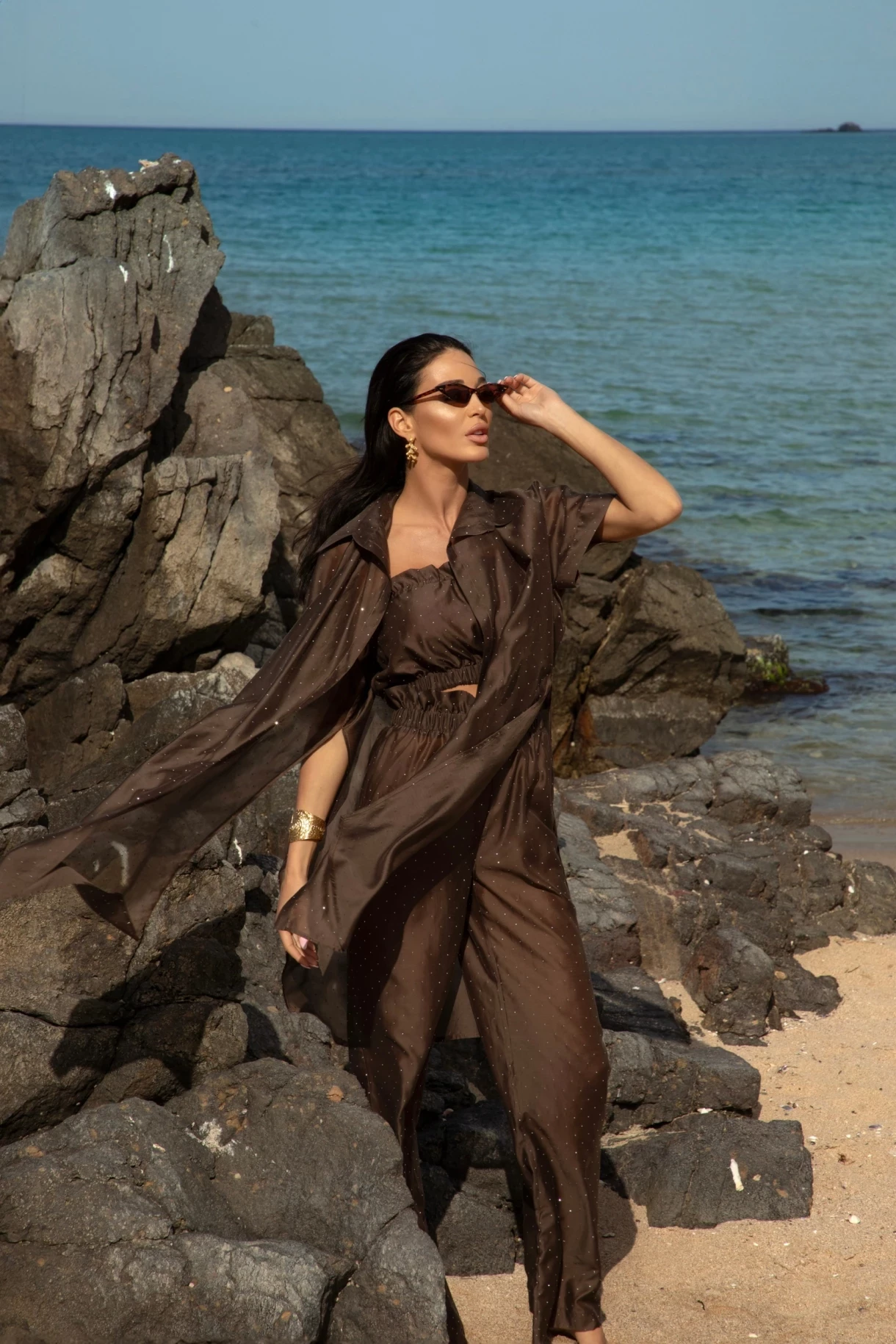 Ефектен плажен сет от топ, дълъг панталон и халат, изработени от нежен и фин лиосел с разкошен фин блясък. Халатът е със свободен силует, яка и ефектни ръкави. Моделът може да се носи и със завръзване в предната му част. Панталонът е с висока талия, ластик и е без подплата. Топът е с право деколте, ластик в горната и долната му част и е изцяло подплатен с памучна материя. Сетът може да се носи и по отделно като част от плажната ви визия с бански.