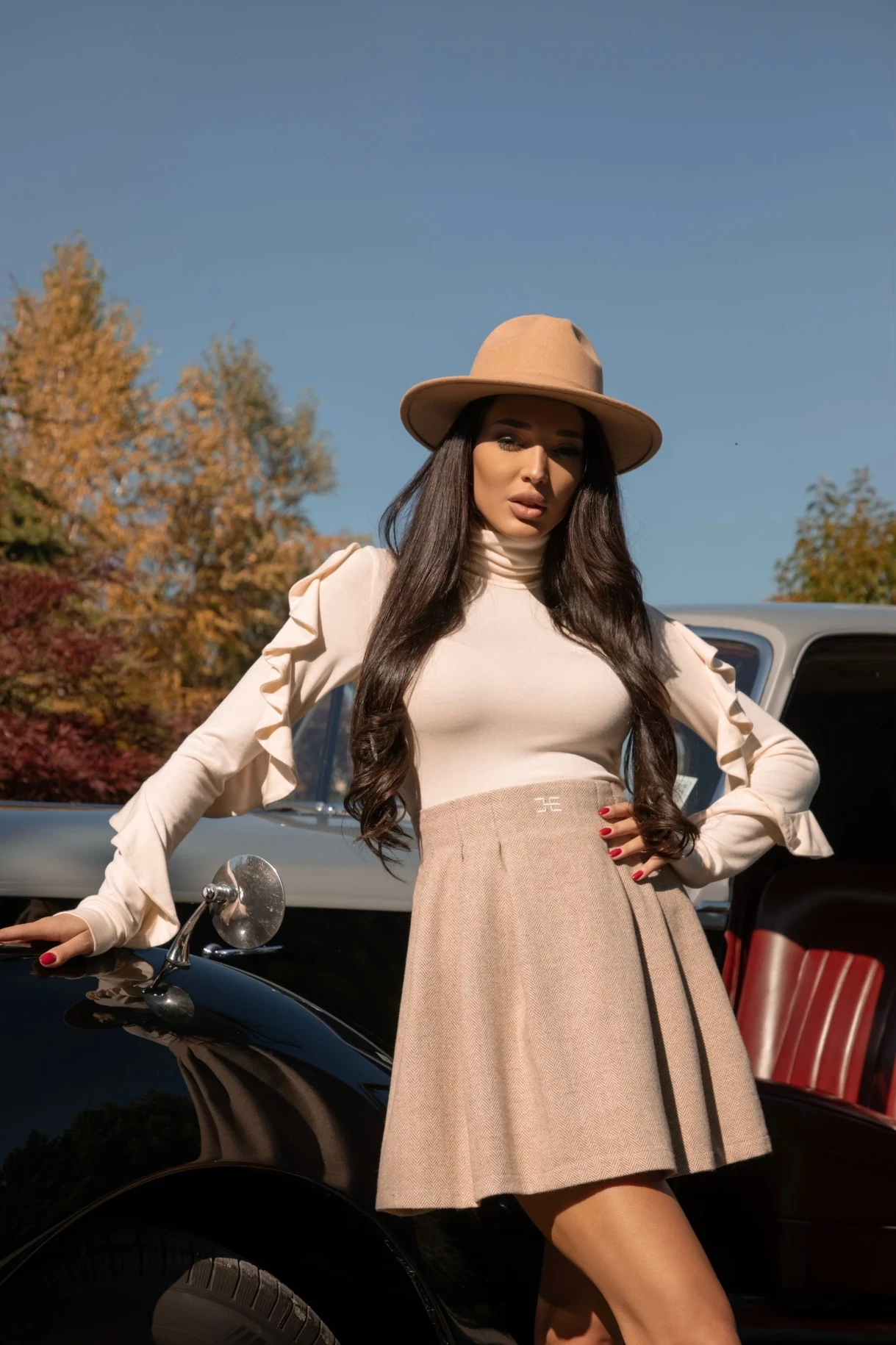 Пола с висока талия, изработена от фина италианска вълнена материя. Моделът е с плохи в предната и задната част и е декорирана с нежна бродерия с лого CHRISTINE. Закопчаване в задната част със скрит "YKK" цип.