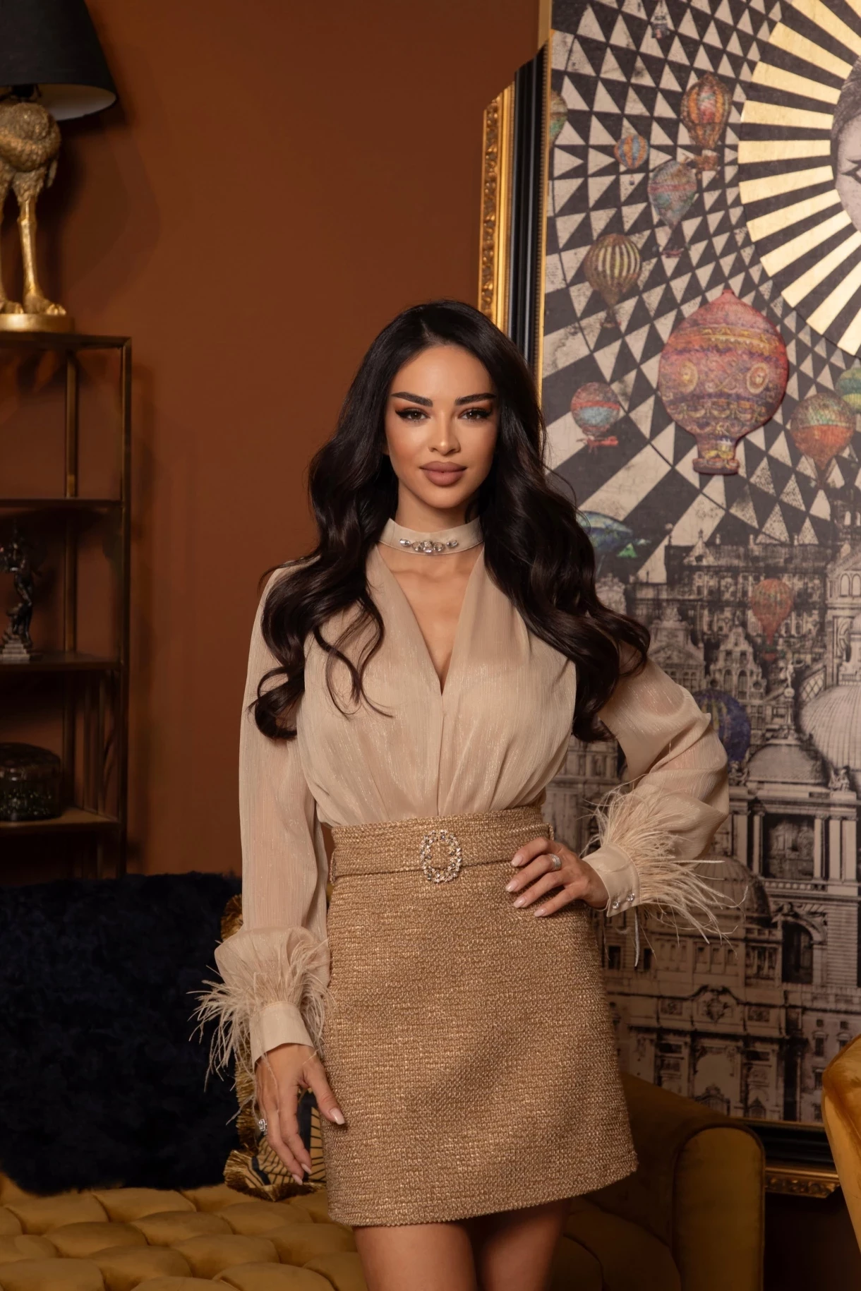 Пола с висока талия с колан от основния плат с метална златиста тока с ефекти кристали. Изработена е от висококачествено италианско букле с нежен блясък, подплатена с луксозен сатениран хастар. Закопчаване в задната част със скрит "YKK" цип.