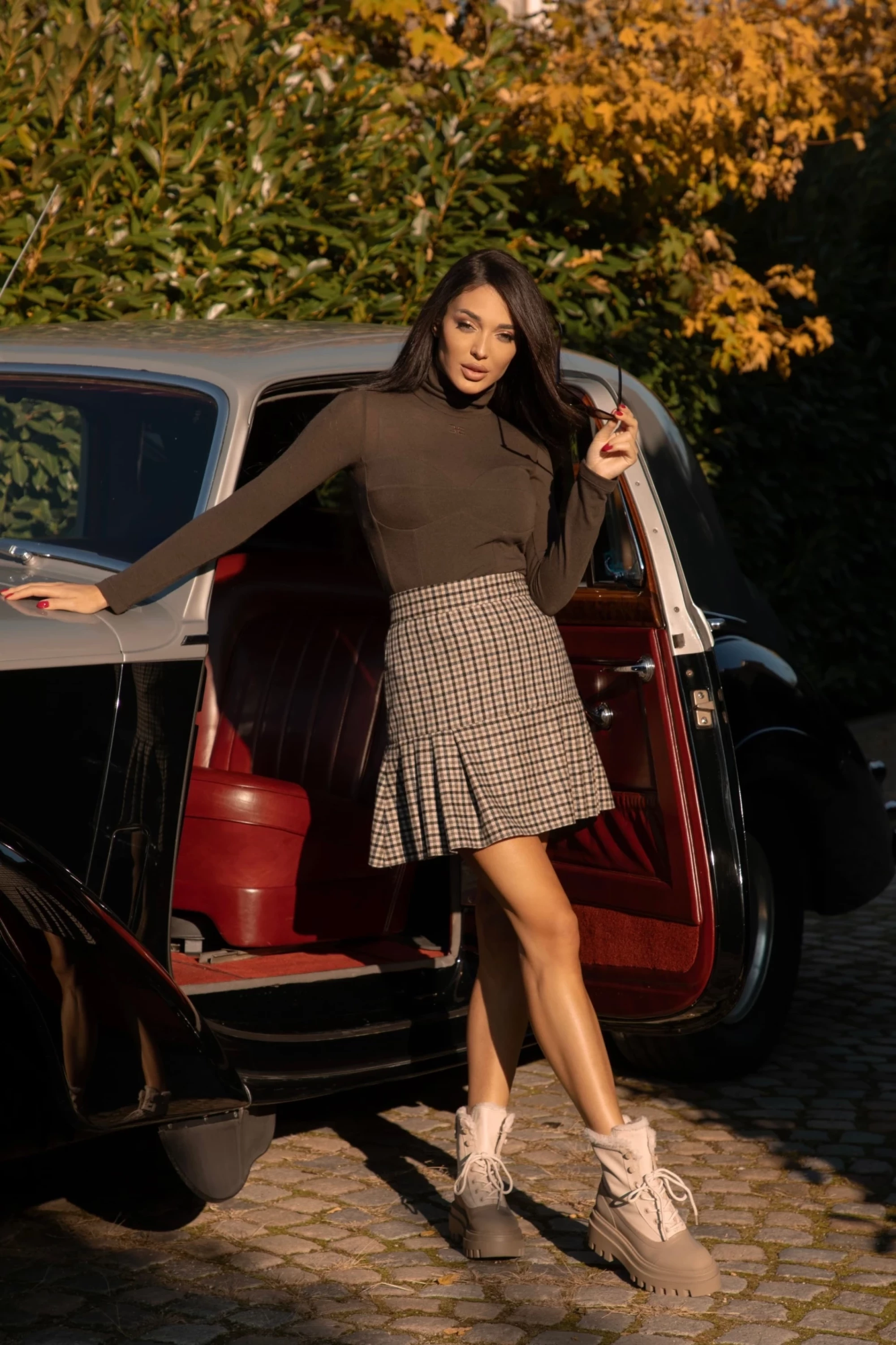 Карирана пола с висока талия, изработена от плътна и нежна вълнена материя. Моделът е с плохи в предната и задната част и е декорирана на колана с нежна бродерия CHRISTINE в кафяво. Закопчаване в задната част със скрит "YKK" цип.