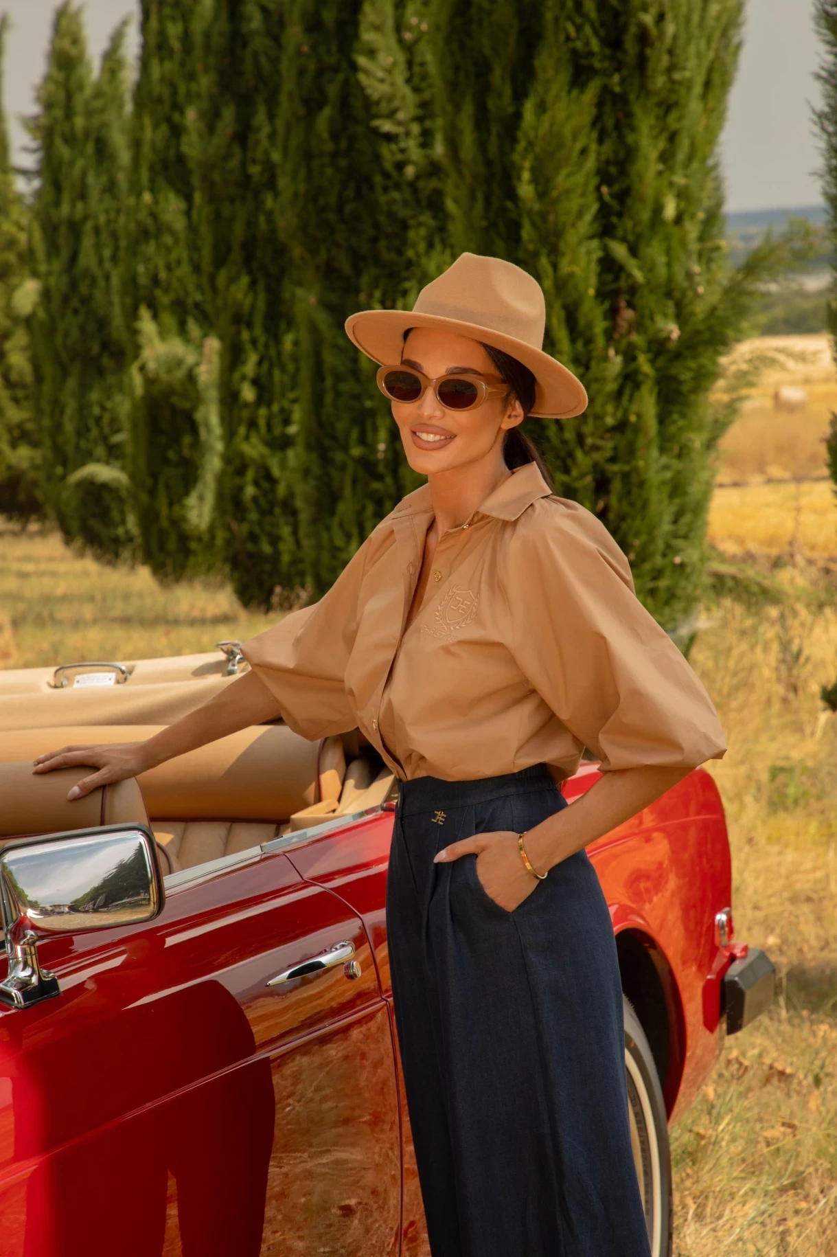 Дамска риза в цвят камел, изработена от памучна материя с красива бродерия CHRISTINE и ефектни ръкави. Ризата е със закопчаване в предната част с метални златисти копчета с лого. Моделът е със стандартна дължина.