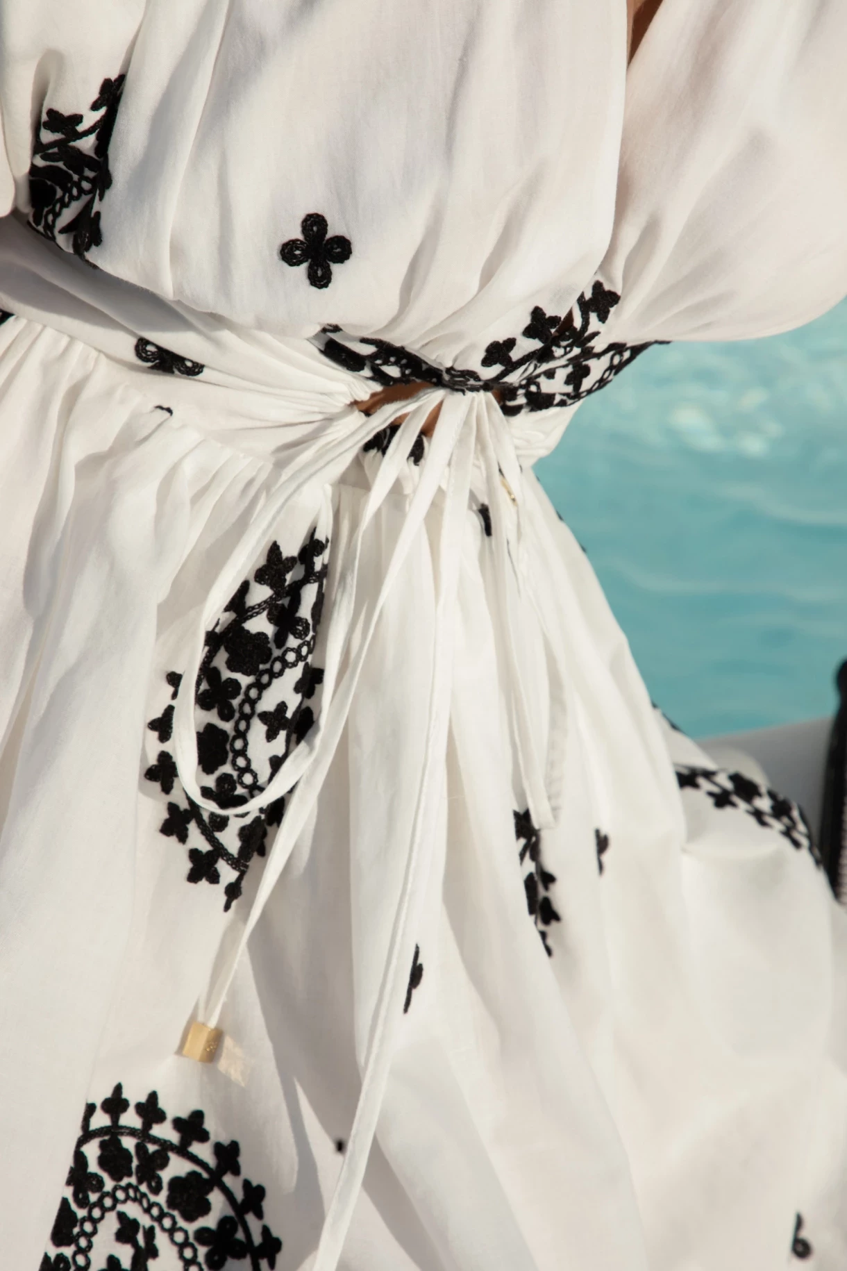Рокля в бяло и черно, изработена от висококачествен италиански памук с бродерия. Моделът е с V-образно деколте, ефектни ръкави и богато разкоена долна част в набор. Роклята е с отвор на талията със завръзване и е изцяло подплатена с нежен памук. Моделът е с метални златисти аксесоари - висулки с лого.