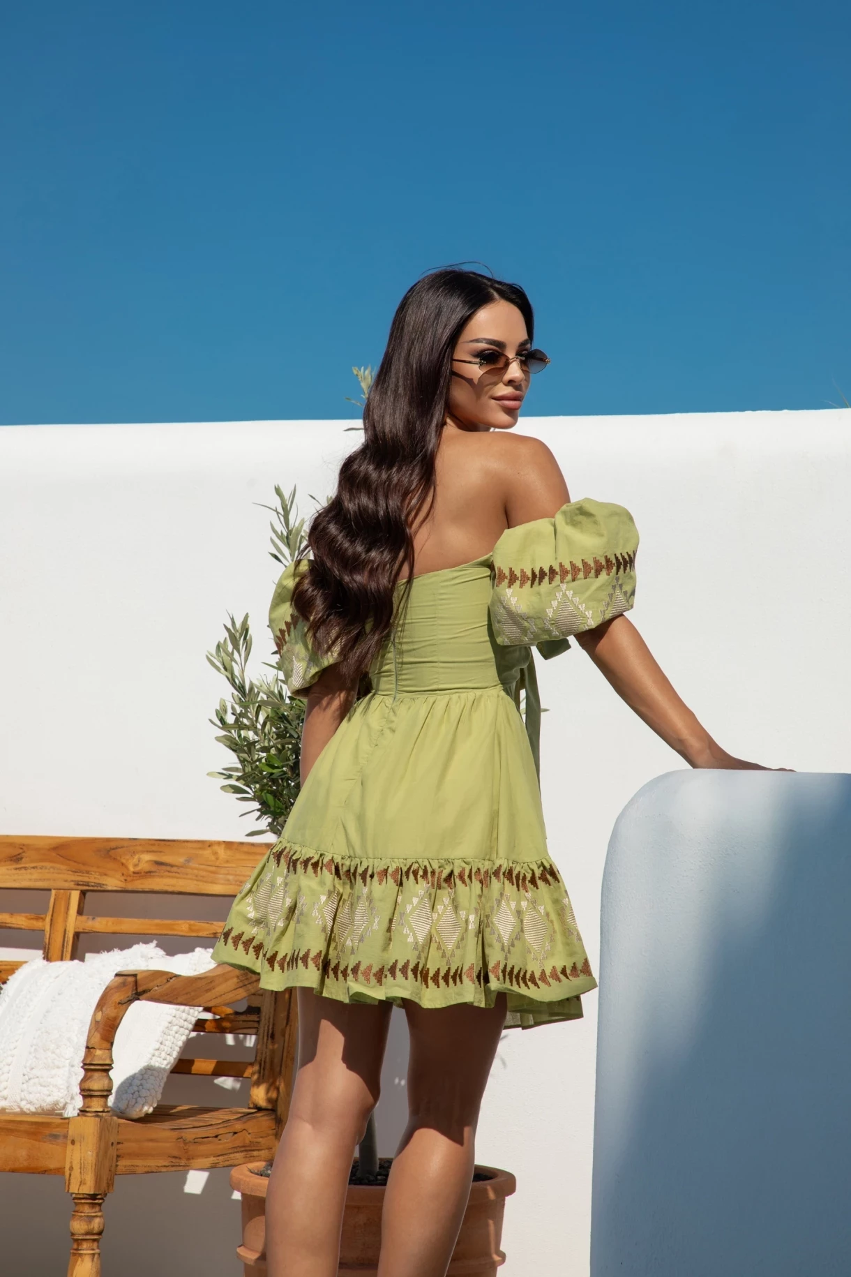 Рокля в зелено, изработена от висококачествен италиански памук с бродерия. Моделът е със сърцевидно деколте, волан в долната част и ефектни ръкави, които може да носите по два начина. Роклята се предлага с отделна връзка от основния плат за завръзване, която можете да носите на деколтето или като аксесоар за коса или чанта. Роклята е декорирана с метална златиста висулка с лого. Моделът е изцяло подплатен с нежен памук.