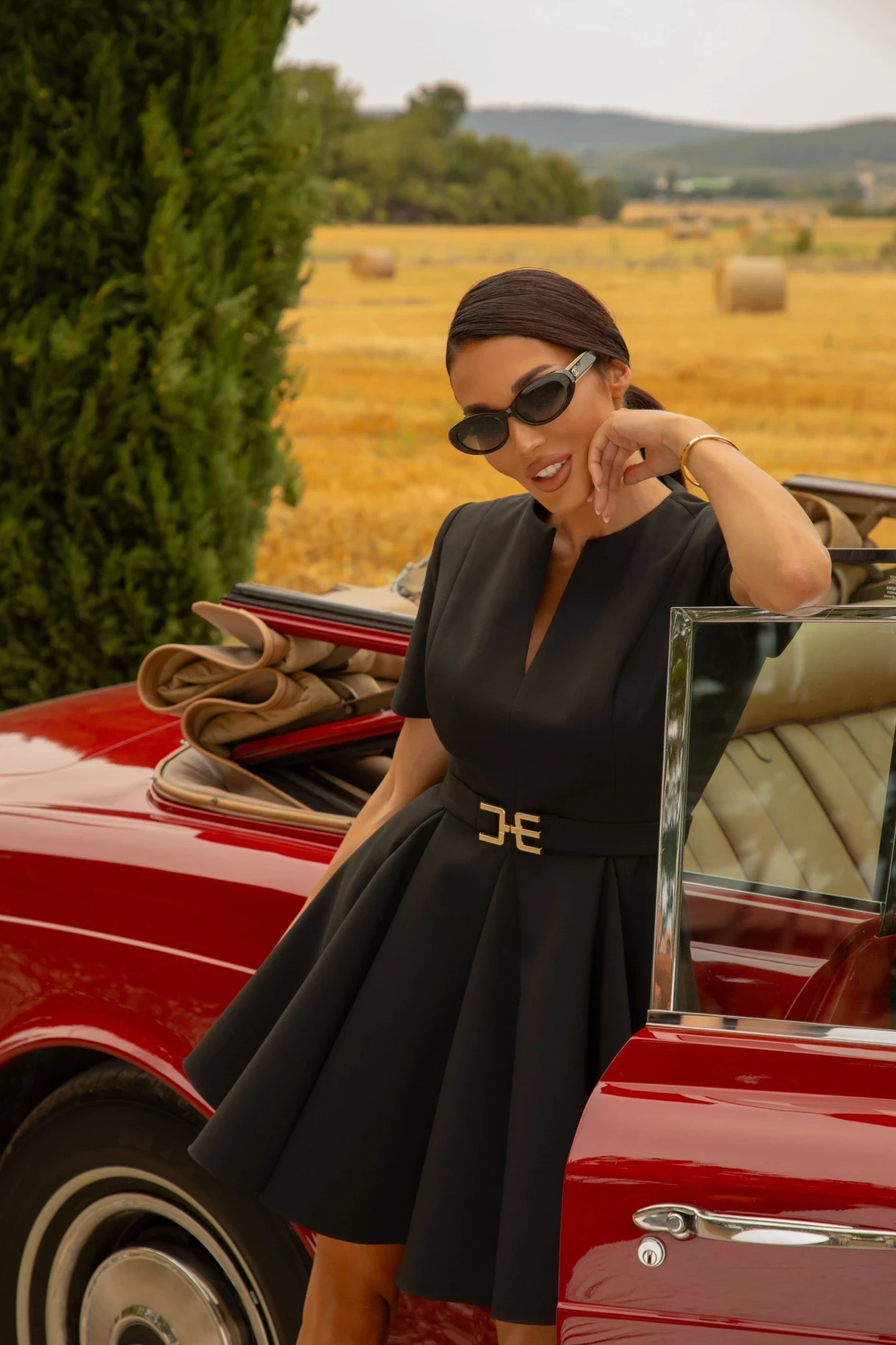 Къса рокля, изработена от плътна тежко падаща италианска материя, изцяло подплатена с луксозна брандирана подплата. Моделът е с къс ръкав, предна част с V-образно деколте и ефектна богато разкроена долна част. Роклята е с колан от основния плат с метална златиста тока с лого CHRISTINE. Закопчаване в задната част със скрит "YKK" цип.