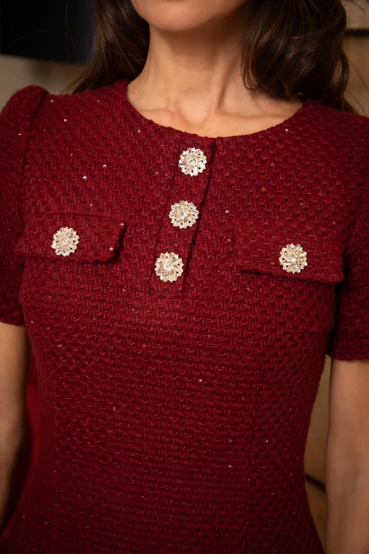 Къса рокля, изработена от италианско букле в бордо с фини бляскави пайети, изцяло подплатена с нежна подплата. Моделът е с къс ръкав, предна част с декоративен пластрон и капаци с висококачествени копчета с кристални камъни и волан в долната част. Закопчаване в задната част със скрит "YKK" цип.