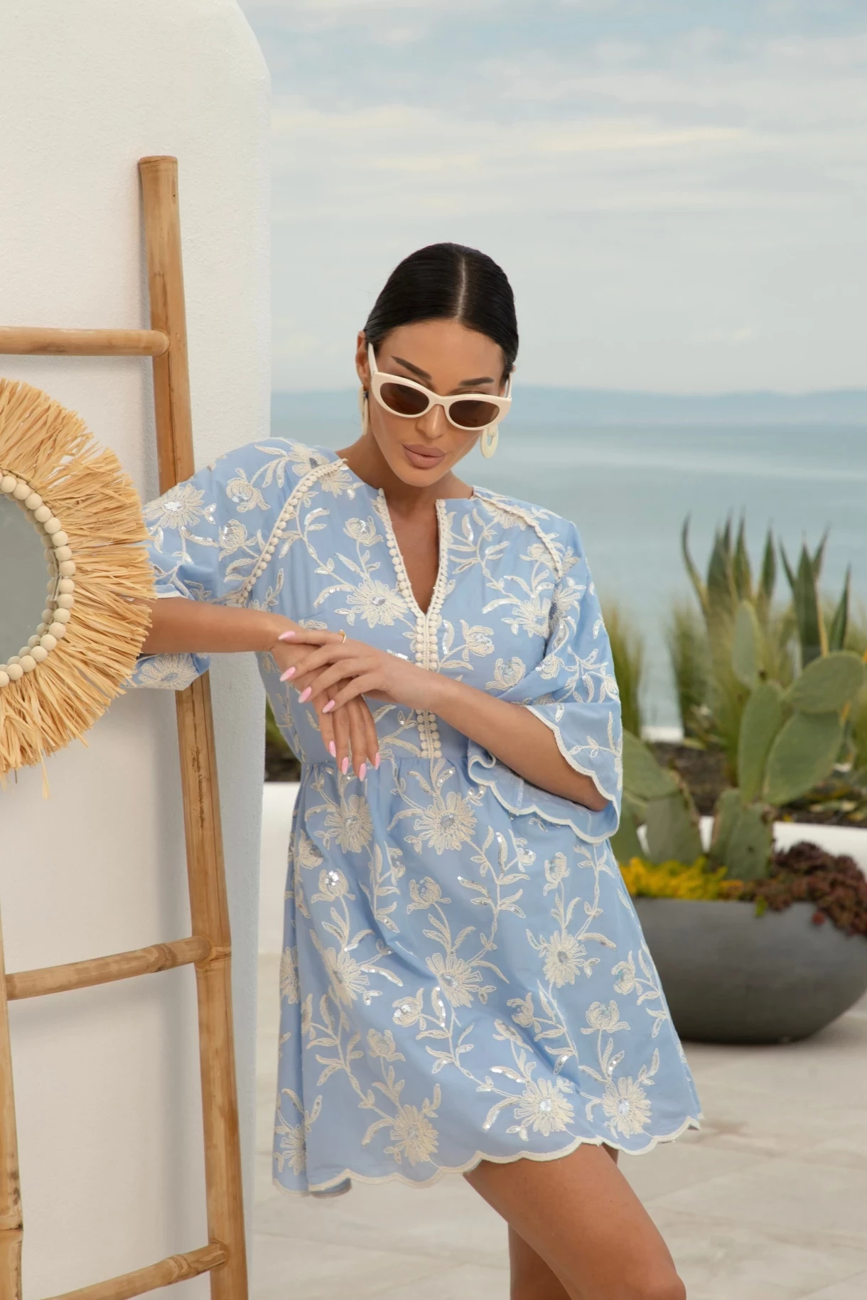 Дамска рокля, изработена от разкошен италиански памук с бродерия и фини бляскави пайети, изцяло подплатена с нежен естествен хастар. Моделът е обкантен с декоративна памучна лента с нежни топченца. Роклята е с красив фестон на гърба, ръкавите и долната й част. В горната част модела е с V-образно деколте, а в долната с ластик в набор и трапецовидна форма. Роклята е с красив гол гръб със завръзване на панделка от ръчно изработени пискюли.