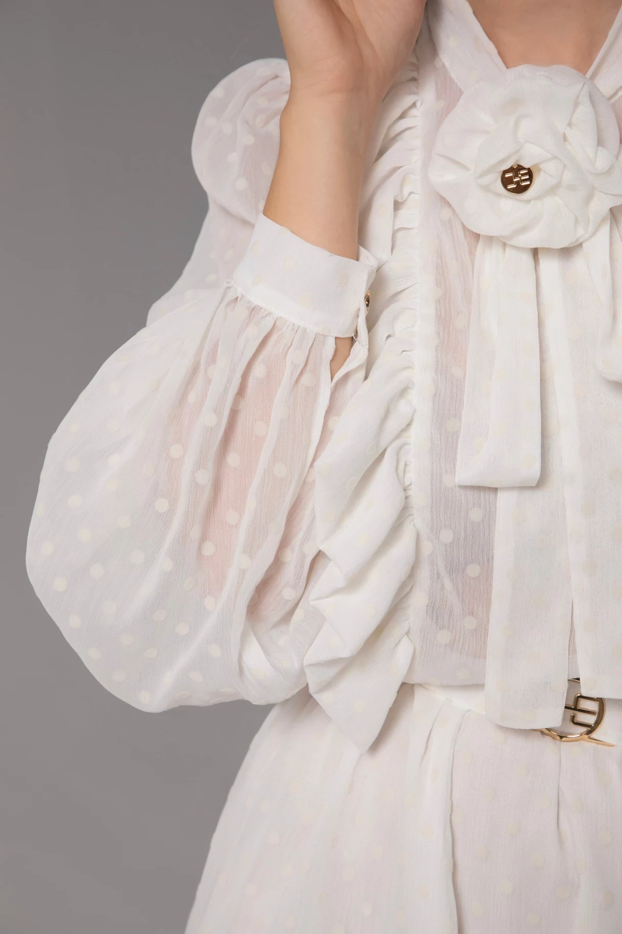 Рокля в бяло, изработена от ефектен шифон с кадифени точки. Роклята е с ръчно изработена брошка-цвете от основния плат с метална златиста висулка с лого. Моделът е с двойни къдри в предната част, завръзване на яката, дълъг красив ръкав и свободен силует. Роклята е с ластик в талията с долна част с волан. Роклята е декорирана на маншетите с метални златисти копчета с лого. Моделът е с отделен колан от основния плат с метална златиста тока с лого "CHRISTINE".