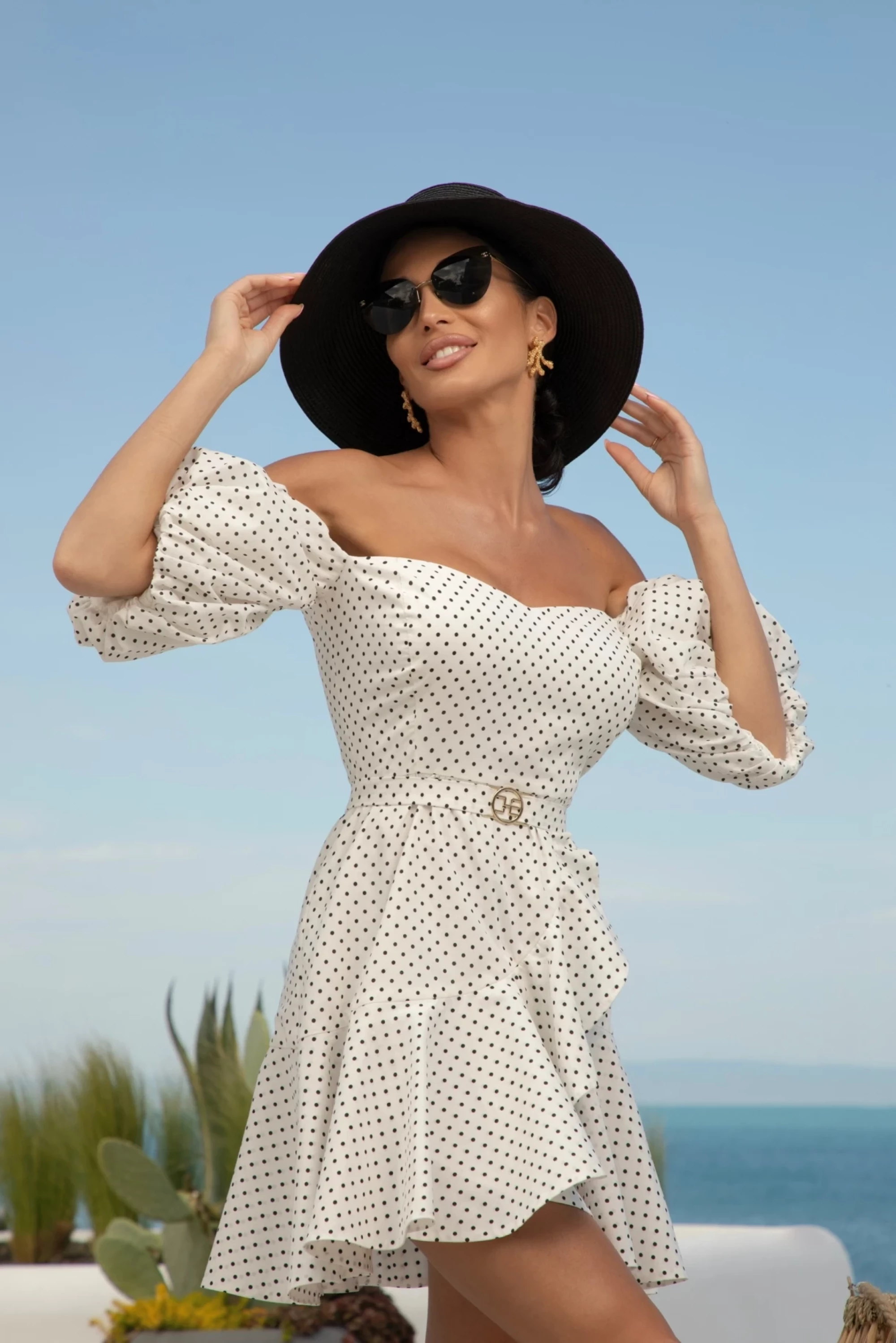 Къса рокля в бяло и черно с бюстие, красиви ръкави и ефектна долна част с двойни волани. Изработена е от нежен италиански памук. Роклята е с отделен колан от основния плат с метална златиста тока с лого. Закопчаване в задната част със скрит "YKK" цип.