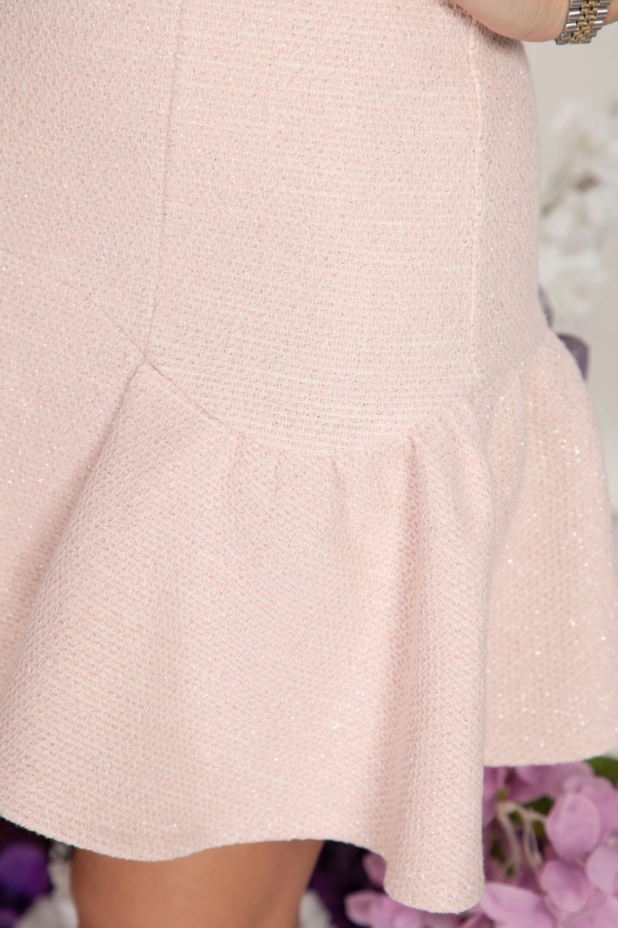 Кокетна пола с висока талия и волан в долната част. Изработена е от нежно памучно букле с фин блясък. Закопчаване в задната част със скрит "YKK" цип.