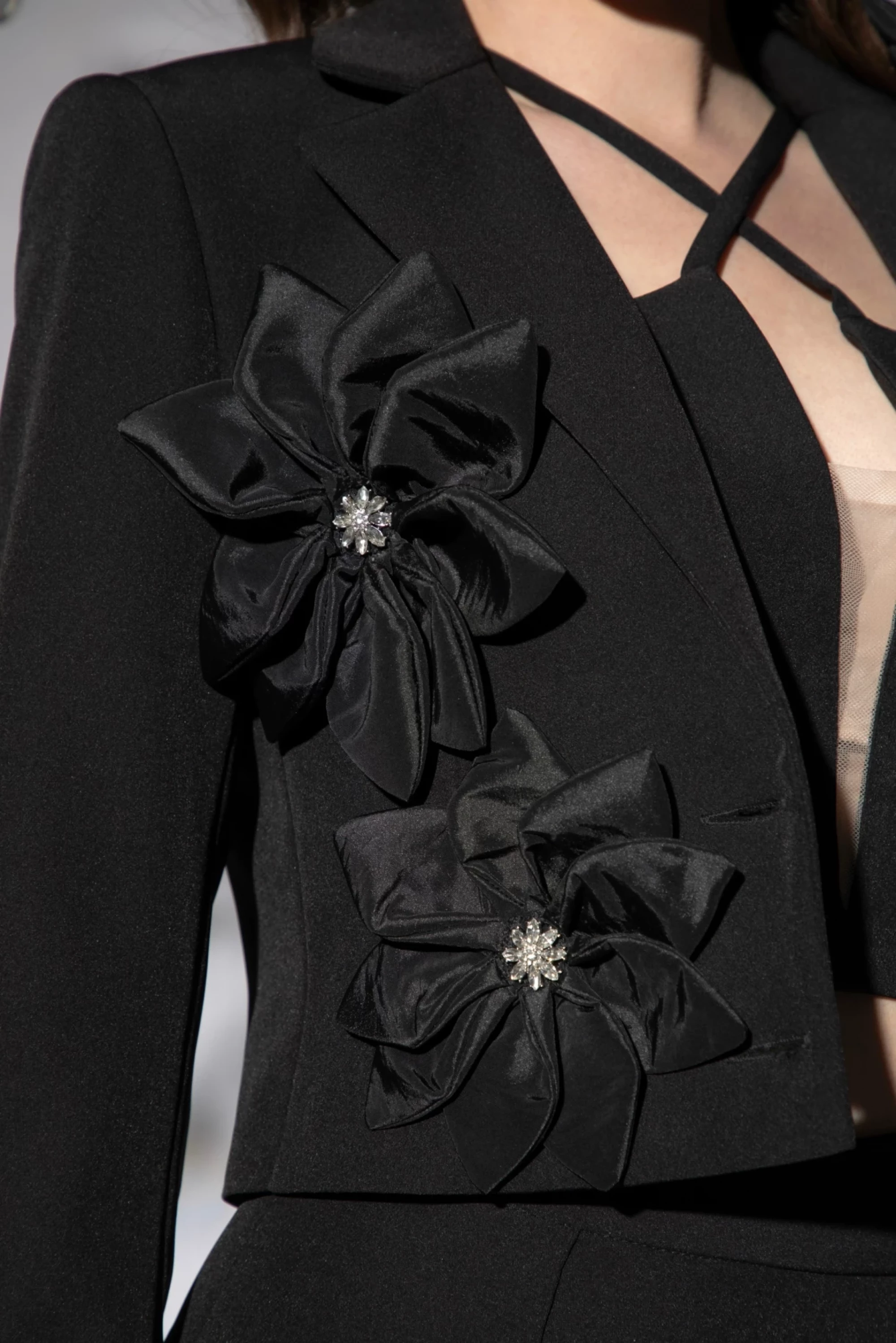 Елегатно сако в черно, декорирано с ръчно изработени цветя с кристални камъни. Моделът е изработен от плътна и нежна материя с лека еластичност и е изцяло подплатено с луксозна брандирана подплата. Сакото е с ревери и едноредно закопчаване с облечени копчета от основната материя.