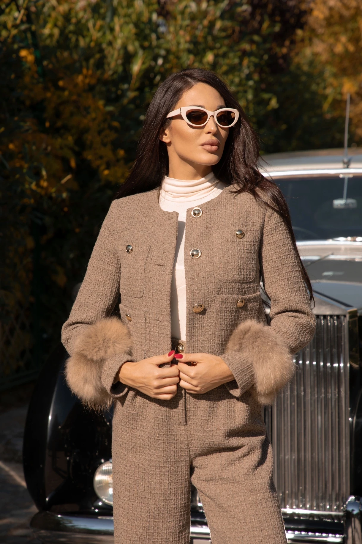 Сако в бежово, изработено от плътно висококачествено италианско букле, подплатено с луксозна брандирана подплата. Моделът е натурален естествен косъм на ръкавите. Сакото е със закопчаване в предната част и е декорирано с джобове с метални златисти копчета с лого CHRISTINE.