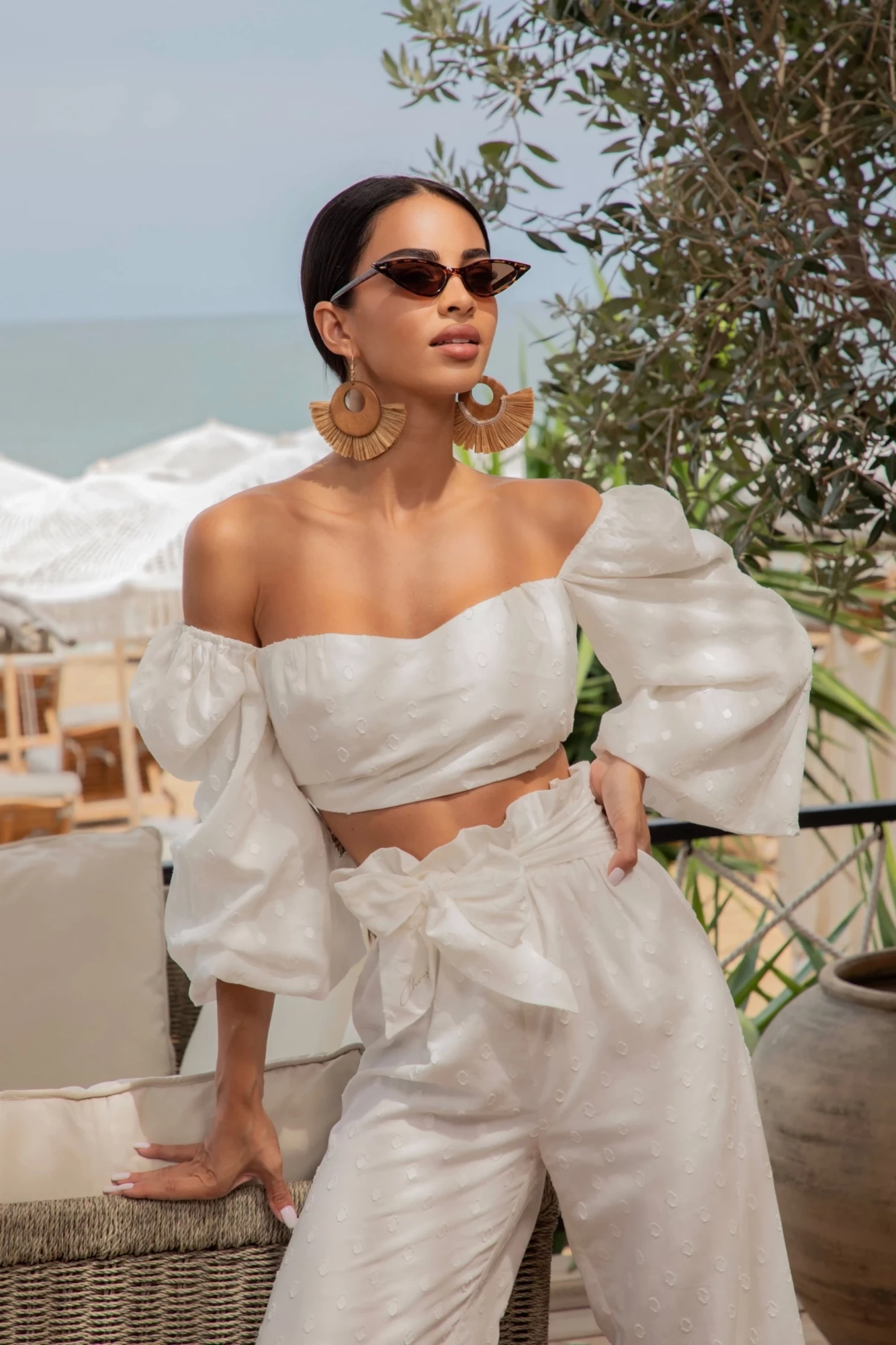 Ефектен сет от топ и дълъг панталон в бяло, изработени от нежен текстуриран памук. Топът е със сърцевидно деколте, ефектни ръкави, закопчаване в задната част със скрит "YKK" цип и е изцяло подплатен с плътна нежна материя с лека еластичност. Панталонът е с висока талия, ластик в талията и е изцяло подплатен с нежен памук. Сетът се предлага с лента с нежна златиста щампа "Christine", която можете да носите като панделка на деколтето или колан на панталона.