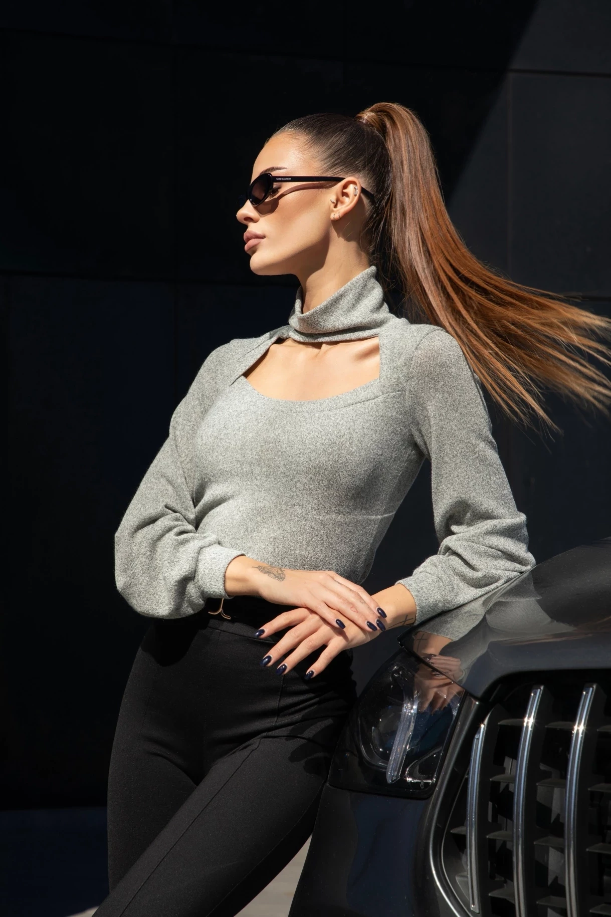 Сив пуловер с дълги ръкави, широки маншети и ефектно деколте. Моделът е изработен от меко и нежно плетиво.