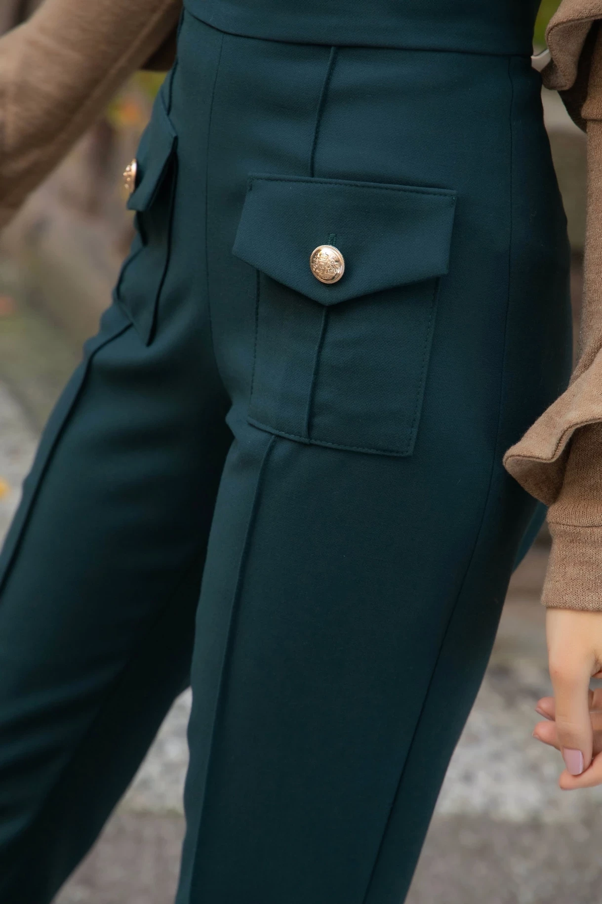 Тъмнозелен/петролен/ панталон с висока талия, ръб с машинен бод и джобове в предната част с капаци и метални златисти копчета. Изработен е от мека и плътна италианска материя с еластичност.