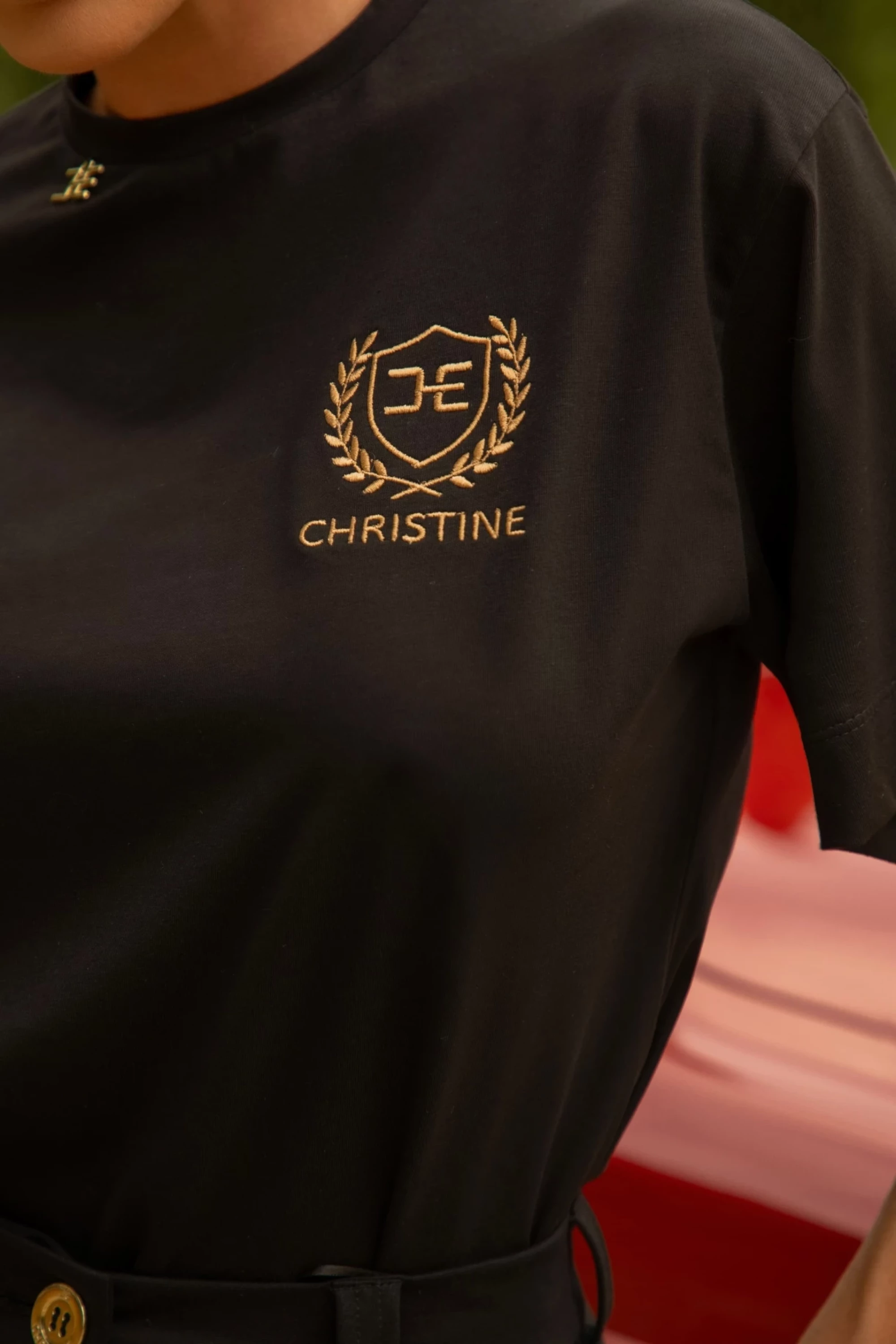 Тениска в черно със златиста CHRISTINE бродерия и декорация на деколтето и ръкава с метална висулка и плочка с лого CHRISTINE. Моделът е с къс ръкав и свободен широк силует. Изработена е от нежен, стегнат висококачествен памук с еластичност.