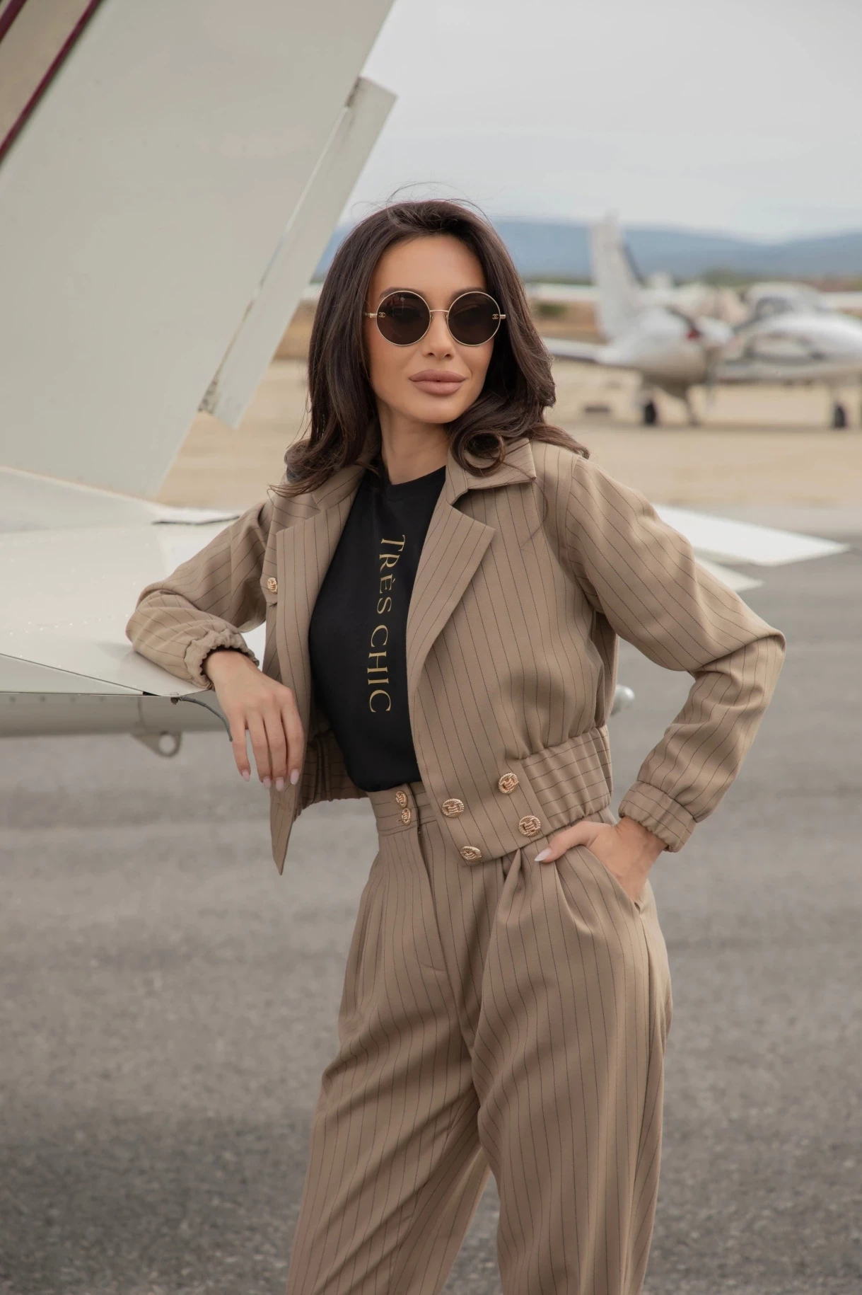 Късо кокетно яке в бежово в райе, изработено е от мека и плътна италианска материя и е подплатено със сатенирана луксозна подплата. Моделът е платка в предната част и закопчаване със златисти метални копчета.