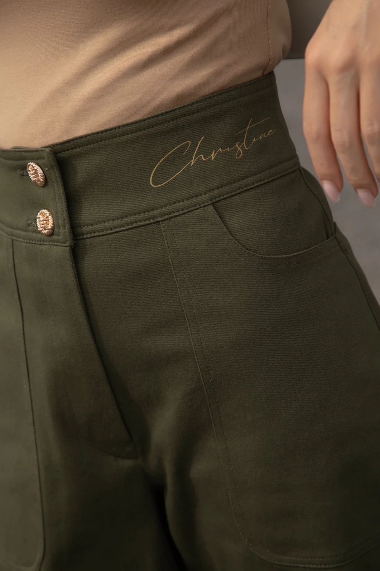Широк панталон в зелено с висока талия, изработен от мека и плътна италианска памучна материя. Моделът е с външни джобове, закопчаване в предната част с ефектни златисти метални копчета и широк подгъв. На талията е декориран с нежна щампа в златисто "Christine".